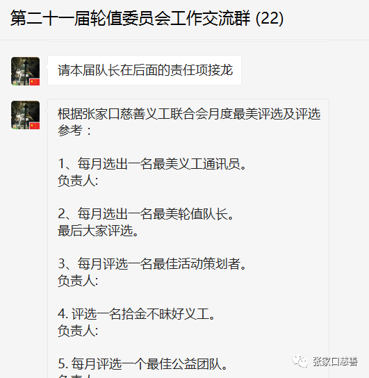 臧沙沙副秘书长汇报上周和本周重点工作;二十二届轮值委员会安排评选最美事宜。上一届与下一届轮值委员会互相认识交流,表示发扬团结协作精神,更好的在轮值期间做好轮值工作。 二十二届轮值委员会成员队伍介绍: Flying Eagle志愿者团队 Flying Eagle志愿者团队成立于2018年,倡导团结友爱、助人为乐、见义勇为、无私奉献的新风和正气。致力于服务大众,回报社会,弘扬爱国主义、集体主义和社会主义精神,促进社会风气的进一步好转。参加本团队的成员,都是无私奉献、拥有爱心的平凡者、诚实守信、持之以恒的施助者。同时,他们还是莘莘学子,怀揣着对未来的美好向往走到一起,尽己所能,不计报酬,帮助他人,回报社会。他们要用行动为社会注入一片甘霖,洒下一缕阳光,要让世界看到年轻的身影正活跃在时代的臂膀,为2022年冬奥会的顺利举办贡献自己的一份力量,献出自己的绵薄之力。 丽霞广场舞义工队 丽霞广场舞义工队有20多人,大部分以女性组成,每天在广场早上8点跳广场舞。也参加了很多其他形式的志愿服务活动。每次参加活动队员们都很积极,不怕吃苦。希望广场舞这种民间的形式,让更多的人去了解,参与到全民健身活动当中来,增强体质,提高身体免疫力,愉悦身心,强身健体。 上谷文化研究会上谷文化研究会是在中国共产党领导下,在张家口市社科联具体指导下,由宣化区委宣传部主管的宣化地区学者、专家和文化爱好者组成,经过注册的公益性民间社团。旨在研究地域历史,开掘文化资源,向社会各界提供国学讲座,开展多种形式的优秀传统文化普及活动,研究地域文化,树立地方文化符号。现有会员120名。 王家房小学益心善小小义工队”团队简介 一、义工队的目的和宗旨 弘扬中华民族助人为乐、团结友善的传统美德,帮助弱势群体,克服困难,摆脱困境,以自己的爱心和实际行动回馈社会,在学校、和社会上宣扬“用善心,献爱心”的主旋律。让我们像一只只火虫样,用爱心燃烧自己,点亮自己,发出一寸光照亮身边的人,个人力量虽然有限,我们可以使小溪汇流成河,通过我们共同努力,必将迎来充满爱心的明天 二、社团特色 弘扬中华民族助人为乐、团结友善的传统美德。 “益心善小小义工队”活动内容将围绕“敬老、扶贫、助残助学、环保、社区服务和公益宣传”开展了形式多样的志愿服务活动。使我校的志愿者活动逐步成为我校工作的一个品牌。 |