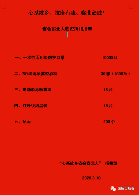 (捐赠一次性医用级防护口罩) 在疫情防控危机时刻,远在石家庄的同乡捐赠物资更是雪中送炭。疫情无情,大爱无疆。“心系故乡省会察北人”群友用实际行动表达对察北这片故土的关心和热爱。疫情阻止回乡的脚步,但阻止不了为家乡跳动的心。祝愿远在外地的所有同乡身体健康、生活幸福。 上一条:不要过早的摘下你的口罩