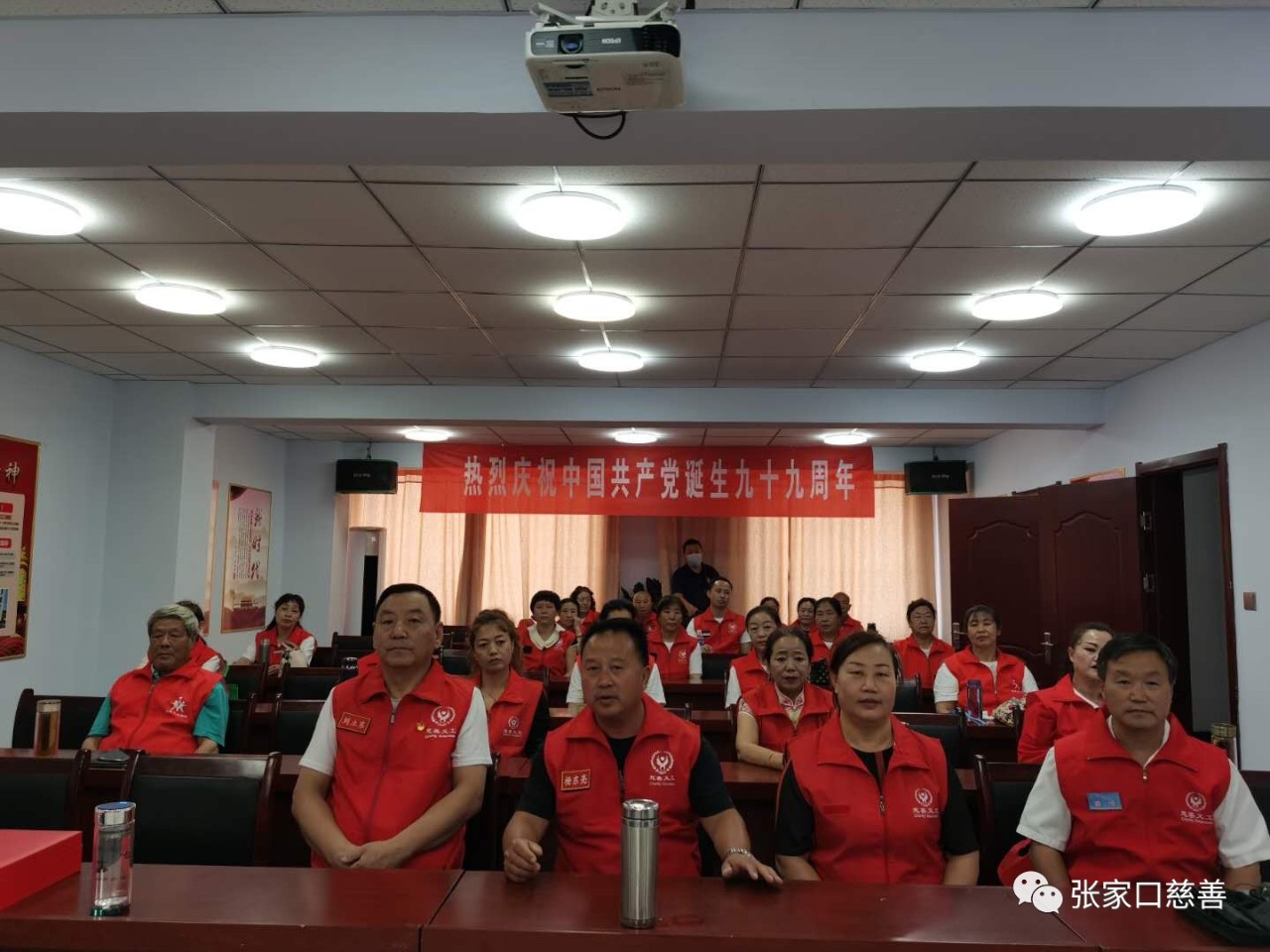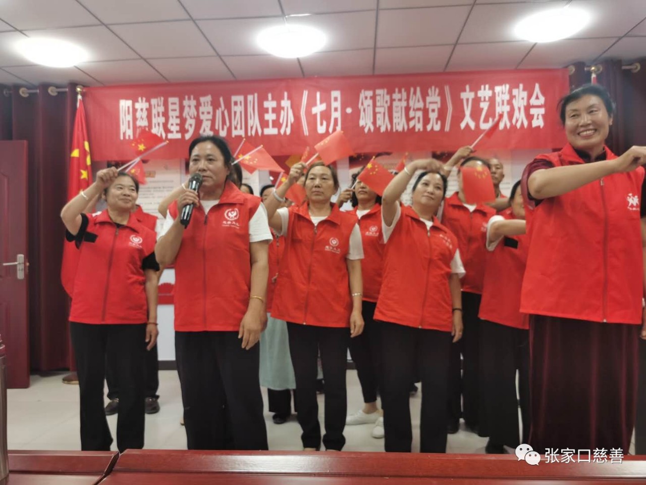 七月,激情似火,歌声嘹亮; 七月,江山如画,党旗飘扬; 穿越血与火的历史烟云,历经战争与建设的风雨洗礼,我们的党走过了99岁生日。 7月13日下午,星梦爱心队主办的“”七月、颂歌献给党”文艺联欢会由主持人杜秀丽宣布正式开始。阳原慈善义工联合会执行会长刘立东等出席了文艺演出,做了简短的致辞并预祝联欢会圆满成功!星梦爱心队袁成队长讲话中感谢春风送暖爱心队、红丝带文艺队、雷锋理发队、皮草爱心团队、父老乡亲爱星队的参与和支持。志愿者代表傅兆祥分享了做志愿者的快乐。 志愿者们以饱满的热情在滚烫的旋律伴奏下,用《没有共产党就没有新中国》唱出了亿万人民的心声!娴熟的手语舞让人陶醉,他们用灵活的手指演示出志愿者们心中对祖国的爱表现的淋漓尽至。