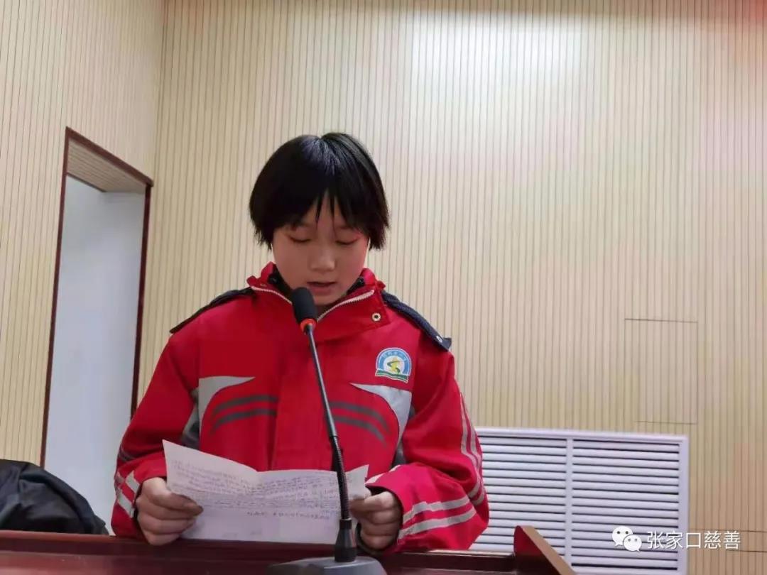 贫困学生及其家长讲话 参加捐助仪式有化稍营中心校校长陶治云,副校长班铁慧,阳原慈善义工联合会会长刘立东,副会长路贵祥、张爱生、吕志强,顾问鲍玉珂、马占海,会长助理郭海龙,副秘书长郭志英,党总支委员关键。爱心团队队长及负责人田广阔、任秀兰、尹丽琴、屈利平、吉艳刚、焦大永、徐佳伟、徐增峰。受助的25名同学和家长及在场的老师和同学们以热烈的掌声对大家的到来表示欢迎和感谢!阳原义工联会长助理郭海龙主持。