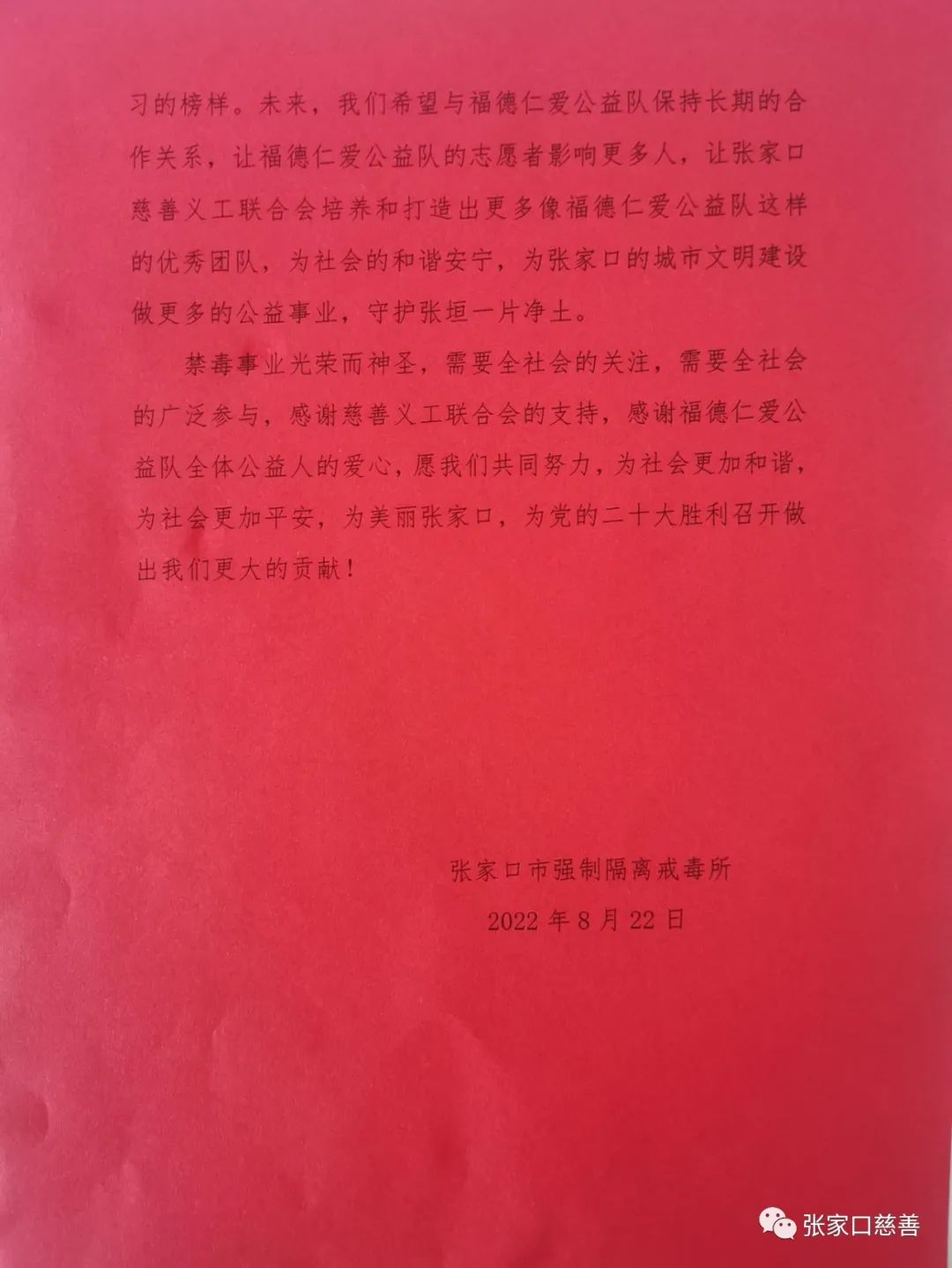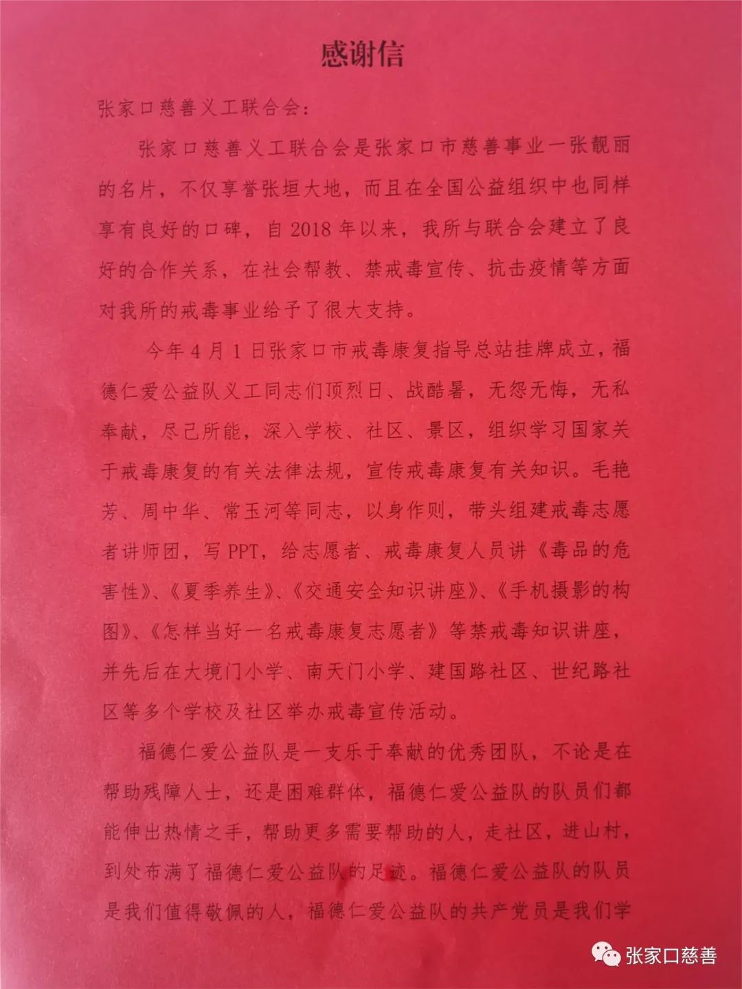 【感谢信】张家口强制隔离戒毒所致张家口慈善义工联合会的感谢信