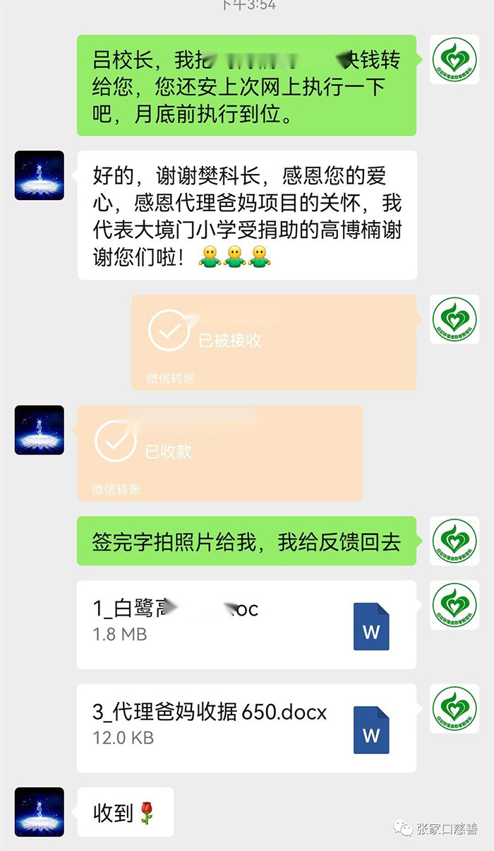 2022年11月29日,白鹭环保志愿者服务队在网上执行了一个“爱心让这个冬天更温暖——代理爸妈项目”。本项目是河北慈善联合基金会“代理爸妈项目”。在全市上下共同阻击疫情的特殊时期,收到了特殊的温暖,首先张家口慈善义工联合会把捐赠款转到白鹭队樊志霞的账户,樊志霞联系大境门小学吕威副校长,用微信转账方式进行。