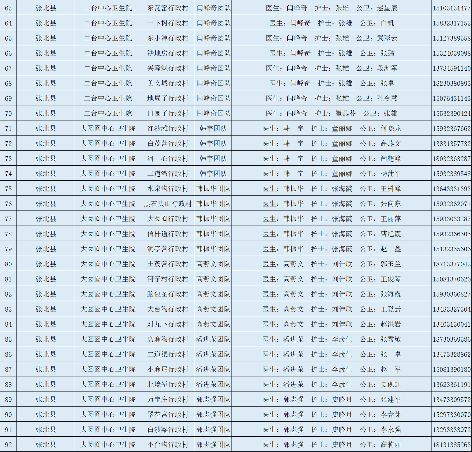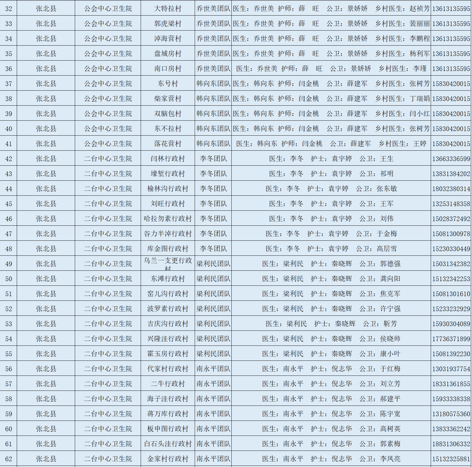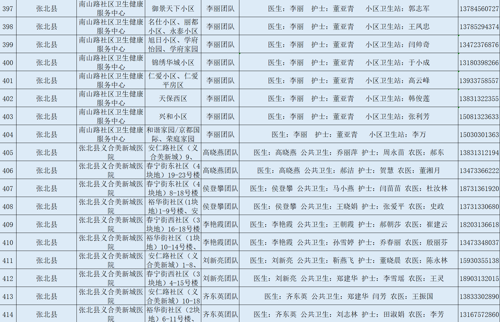 为了更好地满足居民群众就近就医需要,现将张北县家庭医生团队信息及服务范围予以公示,如出现发热、咳嗽等症状,居家治疗不见好转时,可联系相应的家庭医生团队,家庭医生将根据您的具体情况提供相应的服务。