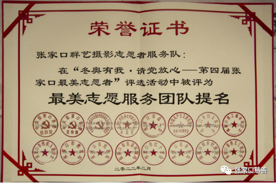 张家口群艺摄影志愿服务队, 从农村到城市, 从街道小区到长城之巅。 从抗疫行动,到服务民众, 从张垣大地,到华夏神州, 都有摄影队员留下的雷锋精神和光影。 多次提名张家口市最美团队称号!
