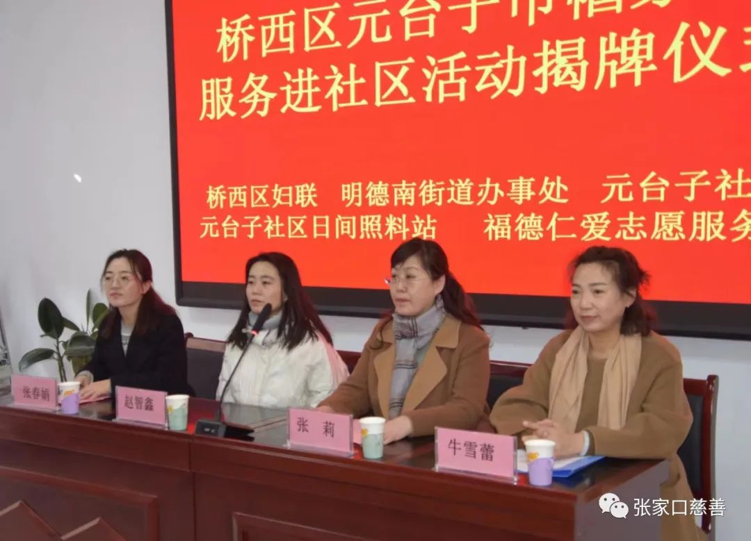 3月4日,福德仁爱公益队入驻桥西区元台子社区巾帼志愿者服务站,正式成为志愿者公益团队入驻社区直接参与社区日间照料的社区服务队伍。桥西区妇联,明德南街道办事处,元台子社区日间照料服务站,福德仁爱公益队共同举办了这次揭牌仪式。