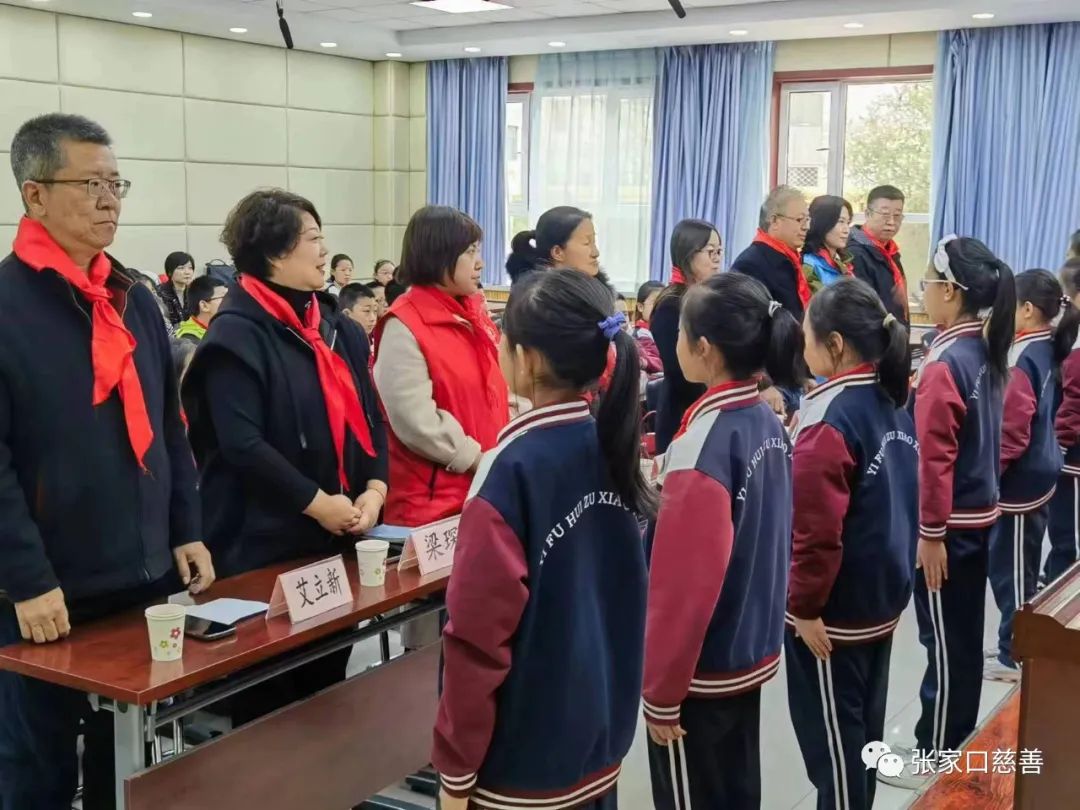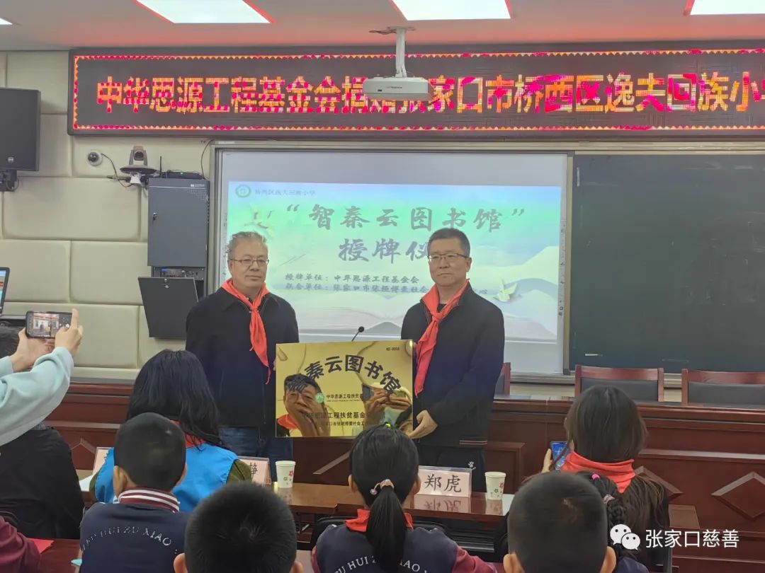 活动一开始少先队员向领导和来宾敬献红领巾。为倡导队员们要树立绿色文明意识和可持续发展意识,推动国家生态工程建设,为母亲河更好的造福中华民族和实现全球生态平衡做贡献。张家口市桥西区农业农村局河长办公室在桥西区逸夫回族小学开启“小河长—小湖长全国青少年志愿服务”项目启动仪式,宣布在桥西区逸夫回族小学四一中队成立“母亲河中队”的决定,并为四一中队授旗。随后由张家口市桥西区农业农村局副局长、河长办副主任刘靖宇,桥西区逸夫回族小学校长梁琛共同为马司琪、杨棱萧等20名优秀队员颁发“小河长”聘任证书。少先队员献上诗朗诵《我的环保宣言》,呼吁广大民众践行绿色环保理念。“母亲河中队”的队员现场制作环保书签,书写环保标语,争当护河先锋,做保卫美丽母亲河的积极践行者,励志要在生态文明实践中展现青春担当。为了改善学校及学生的阅读品质,建立良好的阅读条件,助力国家义务教育均衡发展和振兴中华文化,中华思源工程基金会在此项活动中开启“智秦云图书馆”公益项目捐赠仪式,张家口市桥西区民政局慈善社工科科长郑虎代表中华思源工程基金会为桥西区逸夫回族小学捐赠三万元“智秦云图书馆”,桥西区逸夫回族小学党支部副书记艾立新上台接受捐赠。