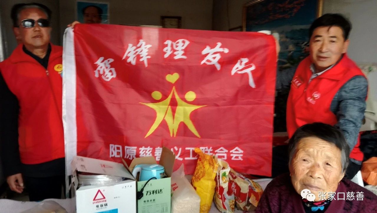 4月27日上午,雷锋理发队王文顺、刘忠两位志愿者带着阳慈善联为老人们备份的孝老多样慰问物品驱车前往四十里地以外的浮图讲乡谢家窑村慰问89岁高龄老人刘玉莲。