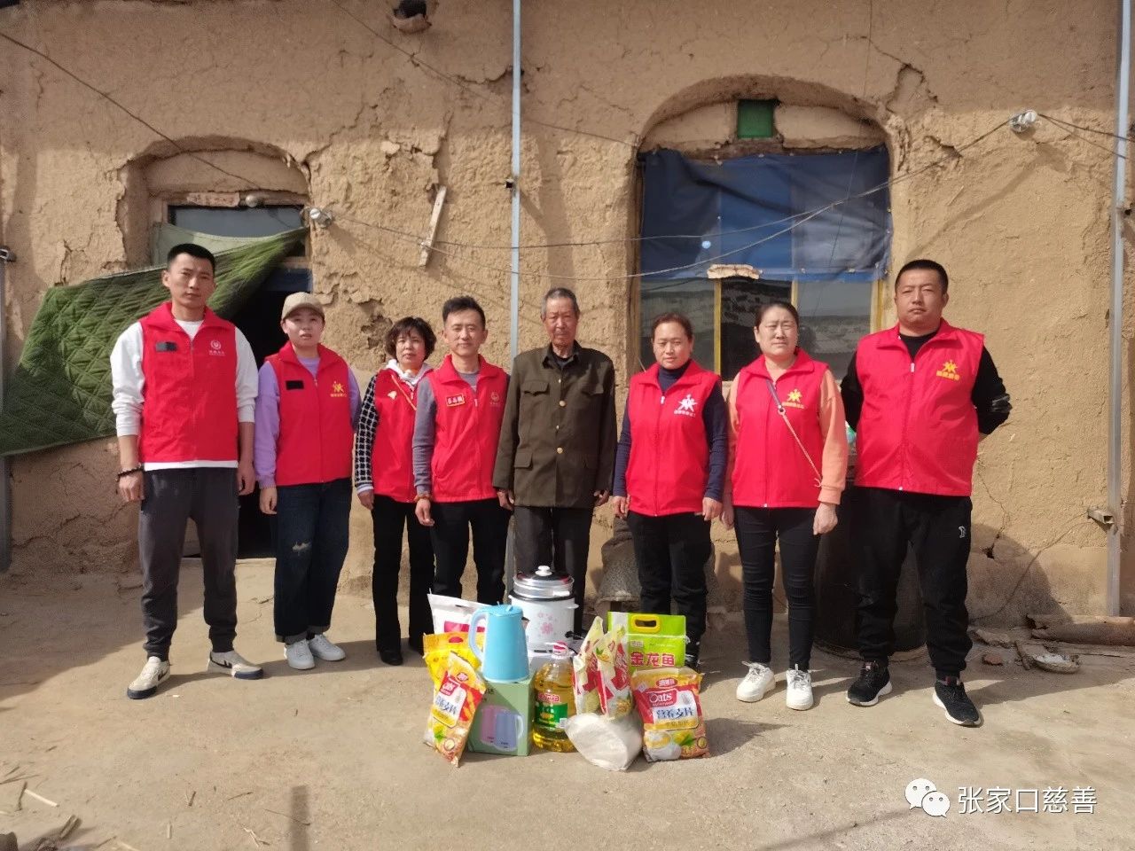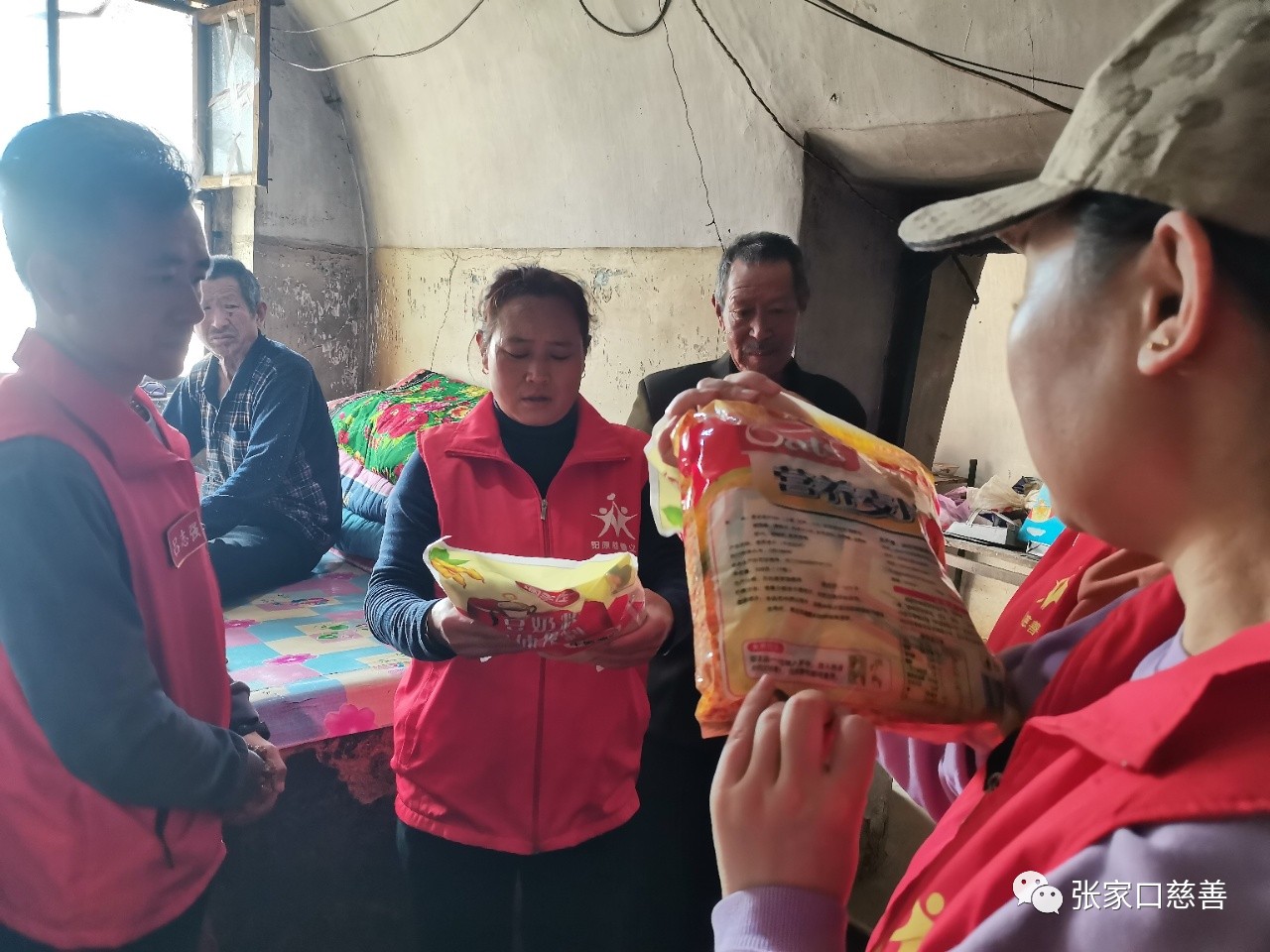 张全义76岁,张全武72岁,两位老人终身未娶,无儿无女,相依为命。弟弟患有脑梗,生活不能自理,院子里甚至还晒着尿褥子,这么多年来一直都是哥哥在照顾他,两位老人的生活十分不容易,经济也十分困难,当志愿者们得知他们的情况之后,立马购买了米面油,以及河慈联“挽手孤寡暖心怀”项目提供的生活必需品来到老人家里慰问。老人们住在破旧的窑洞里,走进去家徒四壁,十分简陋,屋里只有两个破旧的水桶和一些简单的做饭工具。我们都无法想象两位老人是怎么相互扶持着走过这么多年。