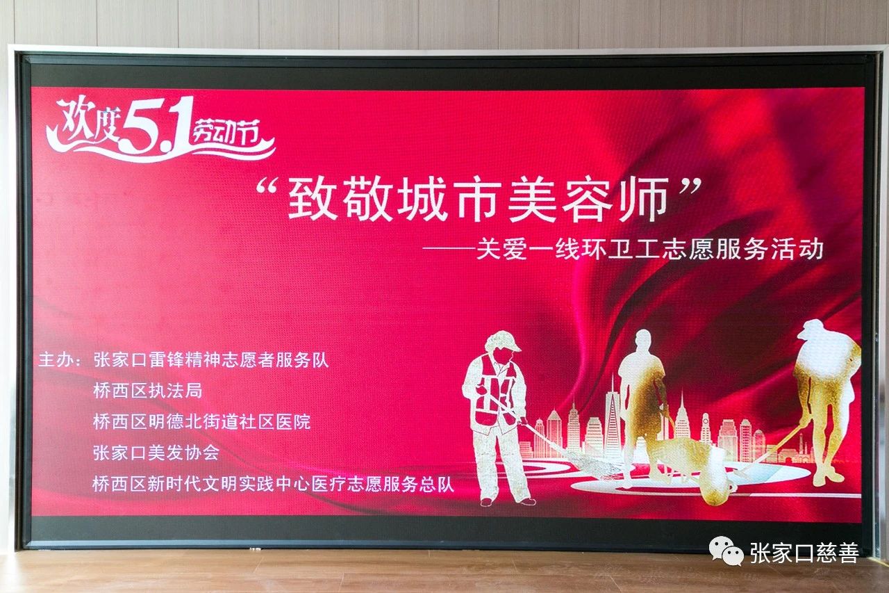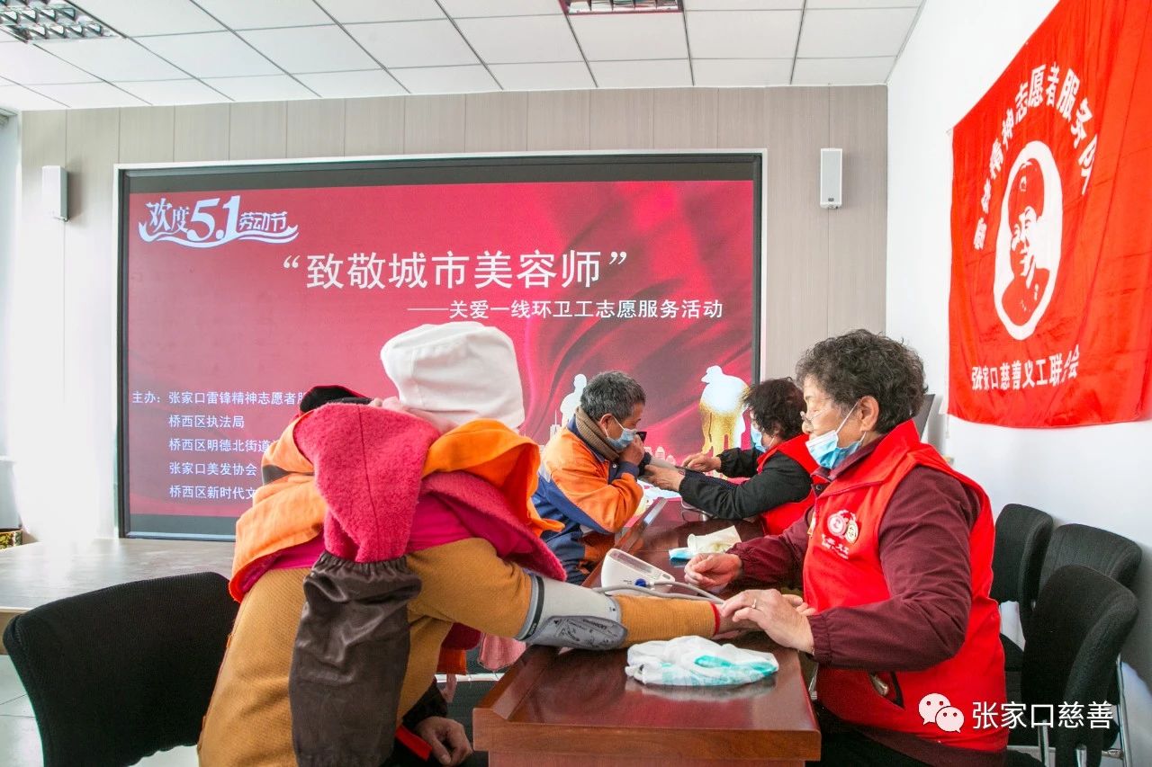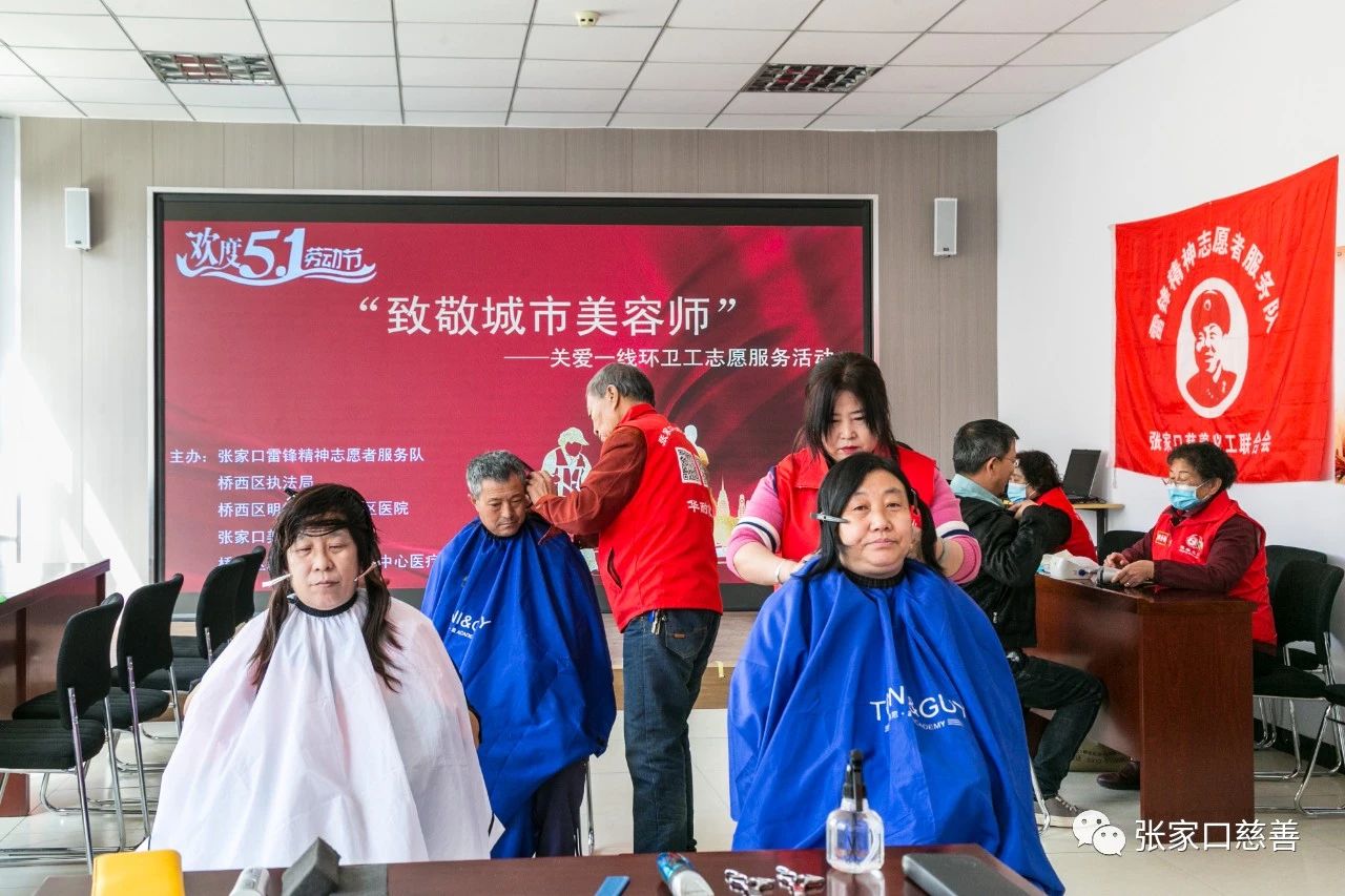 “五月一日”是劳动者的节日!有这么一群人,他们迎来最早一抹晨曦,送走最后一片晚霞,舍得一身脏,换来万家净。他们是我们城市的美容师,始终为我们的城市奉献着自己。这就是受人尊敬的环卫工人。为了感谢他们的无私付出,让人们都能认识到环卫工人的默默奉献,为了让更多的人都学会感恩、学会付出、学会关注身边的默默无闻却一直奉献付出的人群。桥东区慈善义工联合会雷锋精神志愿者服务队于2023年4月30日 早上9点30分在桥西区新时代文明实践中心,为环卫工人师傅们进行了义务理发及义诊的活动。本次活动得到了张家口市桥西区文明办,张家口市美容美发行业协会,桥西区明德北社区医院的大力支持。