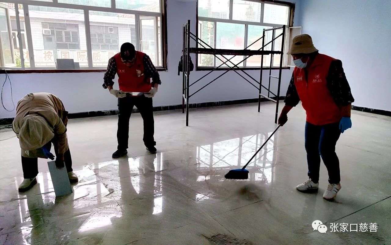 李军会长简要的安排好任务后,北师志愿者马上行动起来,整个二楼三个大套间,都是办公室,前两天刚刚粉刷一新,地面上旧墙皮、石膏粉、腻子粉等遍地都是,有些粘在地面上的石膏块、涂料斑点特别难清理,关键时刻,还是我们老兵大显身手,杨顺、黄秀林和庞润平三位退役老兵,从一楼捡了几块铁皮,从墙角依次往外刮除,马丽华、崔凤英、李俊莲、王小琴及马德生用拖把进一步清理,擦玻璃、门窗、地角线,个个都累的满头大汗,满脸灰尘,一上午忙的谁都没有喝口水,因为时间不等人,地面卫生不清理彻底,办公用品就进不来。中午,简单的吃完饭后,接着再干,直到把地面、门窗清理的干干净净为止,看到用辛勤劳动和汗水换来办公区一尘不染、焕然一新,志愿者们脸上落出了开心的笑容。随后,办公家具、桌椅、电脑等搬进办公室。新的地方新环境,在李会长的领导下,桥东慈善义工联合会工作更有新气象,谱写新成就。