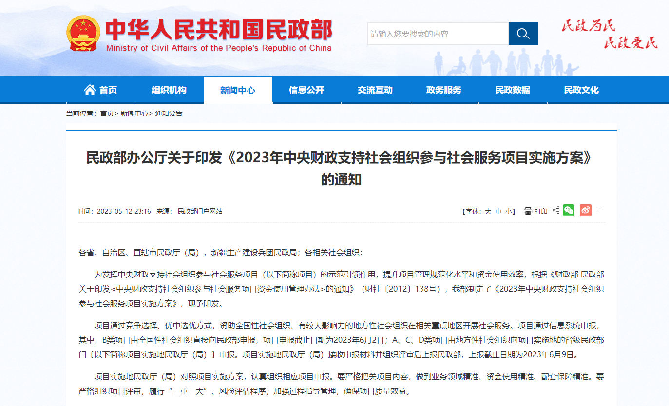 5月12日,民政部办公厅印发《2023年中央财政支持社会组织参与社会服务项目实施方案》(以下简称《实施方案》),进一步优化对中央财政支持社会组织参与社会服务项目的投入与管理,支持引导社会组织更加精准、规范、有效地做好惠民生、暖民心、顺民意的工作。
