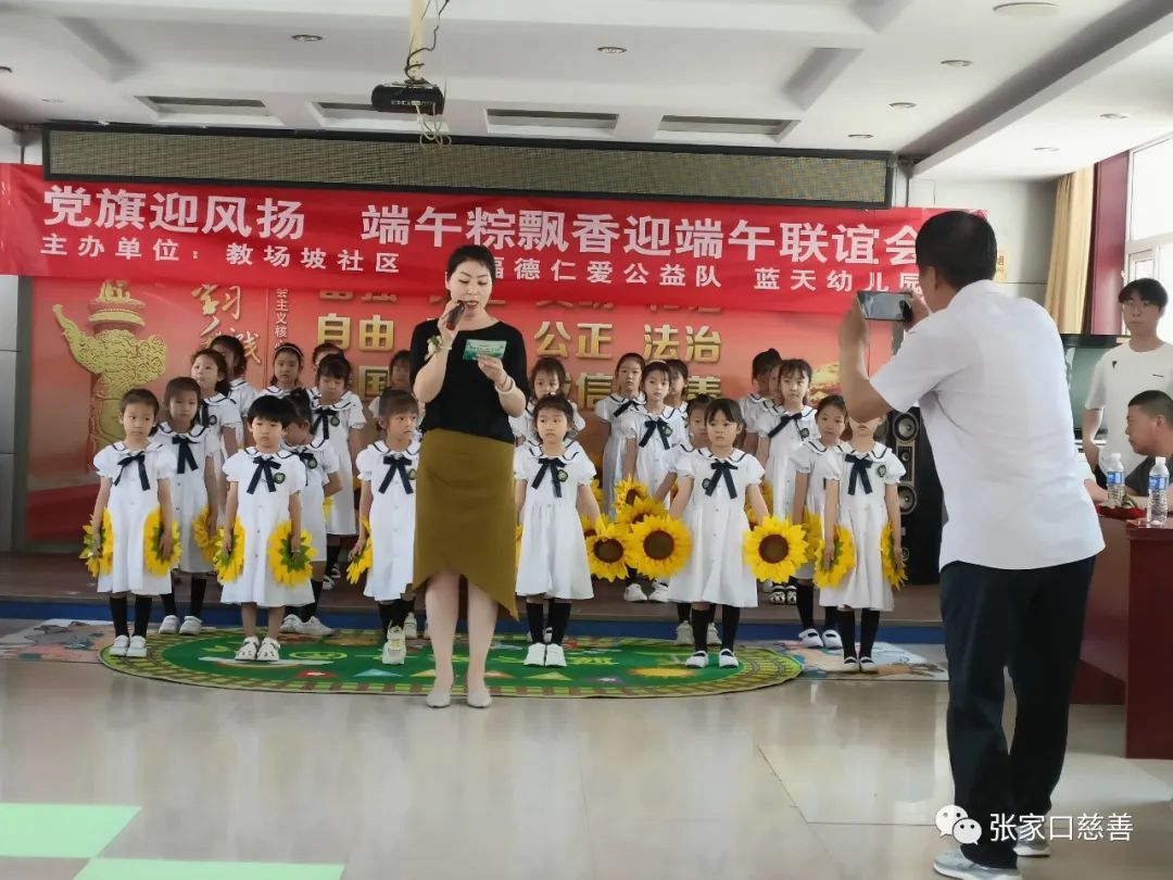 皇甫艳为联谊会现场担任主持人 在端午节到来之际,为弘扬中华传统文化,丰富居民群众精神文化生活,引导大家崇尚爱国、敬业、诚信、友善的社会主义核心价值观,由教场坡社区牵头,福德仁爱公益队承办的教场坡社区浓情端午“粽”享欢乐迎端午联谊会给这里的居民带来了快乐,营造了一个良好的文化氛围。街道办事处书记赵明春、街道办事处主任曹斐、人大工委主任:王黎、张家口慈善义工联合会助残专委会秘书长毛艳芳、福德仁爱公益队周中华、福德仁爱公益队驻教场坡社区志愿服务队队长吕桂贤、教场坡社区日间照料站负责人王秀芬、蓝天幼儿园负责人贾国兰参加了活动,给予了祝贺。福德仁爱公益队对这次活动进行了策划、主持、现场服务,女歌手张紅、景小萍为大家演唱了歌曲,逯易斯模特队为活动表演了旗袍秀,民族舞舞蹈队演出了民族舞、独舞等节目。教场坡社区的高鑫,为大家演讲了《立足平凡岗位,书写青春年华》。通过这样的活动,逐步建立五社联动体系。建设现代化的社区与公益事业的相结合。