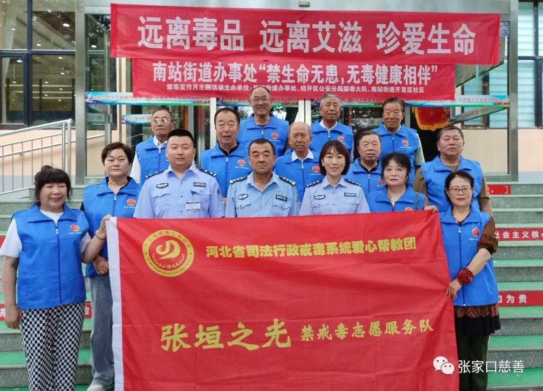 6月20日上午,在禁戒DU宣传日到来之际,张家口市司法局等有关单位在开发区进行了禁戒DU宣传活动。福德仁爱公益队张垣之光禁戒队DU志愿服务队组织退役军人宣传禁戒DU工作,在福德仁爱公益队队长毛艳芳的统一部署下,退役军人志愿服务队长常玉河带领部分退役军人,参加了经开区南站街在社区门前广场开展禁戒DU宣传活动。