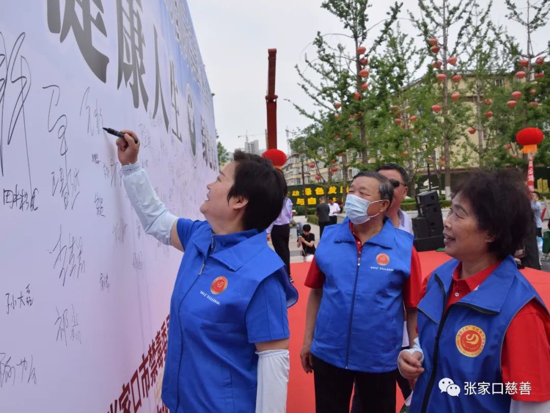 毛艳芳带队在签名墙上签名 这次活动由张家口市禁DU委员会、桥东区禁DU委员会、张家口市人民检察院主办,张家口市中级人民法院、张家口市司法局、张家口市教育局、共青团桥东区委、北方机电工业学校、张家口市第八中学协办。福德仁爱公益队的“张垣之光”禁戒DU志愿服务队是在张家口市司法局注册成立的志愿服务队伍。成立一年来,曾由队长毛艳芳带领队员进社区、进乡村、进校园、进能人集市,宣传DU品的危害性,号召社会各界关注禁戒DU工作,让更多人珍惜生命,远离DU品,建设健康人生,绿色无DU的社会环境。活动在嘹亮的国歌声中开始,活动倡导了“全民动员,全社会行动,掀起禁DU人民战争新高潮”,“健康人生,绿色无DU,全民共建全国禁DU示范城市”。