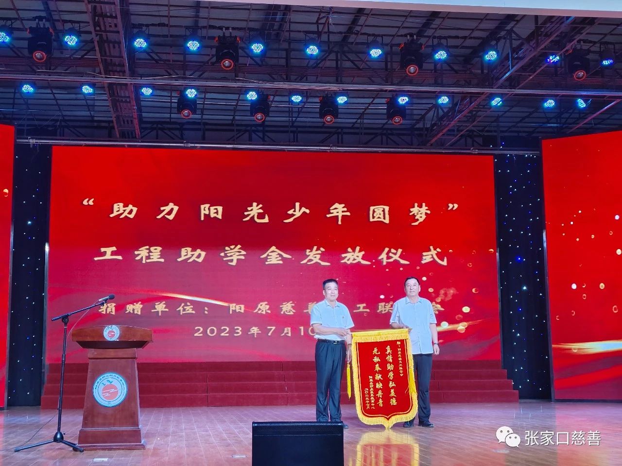 2023年7月10日,阳原职教中心多功能会议大厅欢乐融融,阳原慈善义工联合会在这里为6名家庭困难的高考优秀学生发放“助力阳光少年圆梦”奖助学金。阳原职教中心党支部书记徐磊、校长梁智勇、阳慈联会长刘立东与职教中心800多名师生参加了活动。