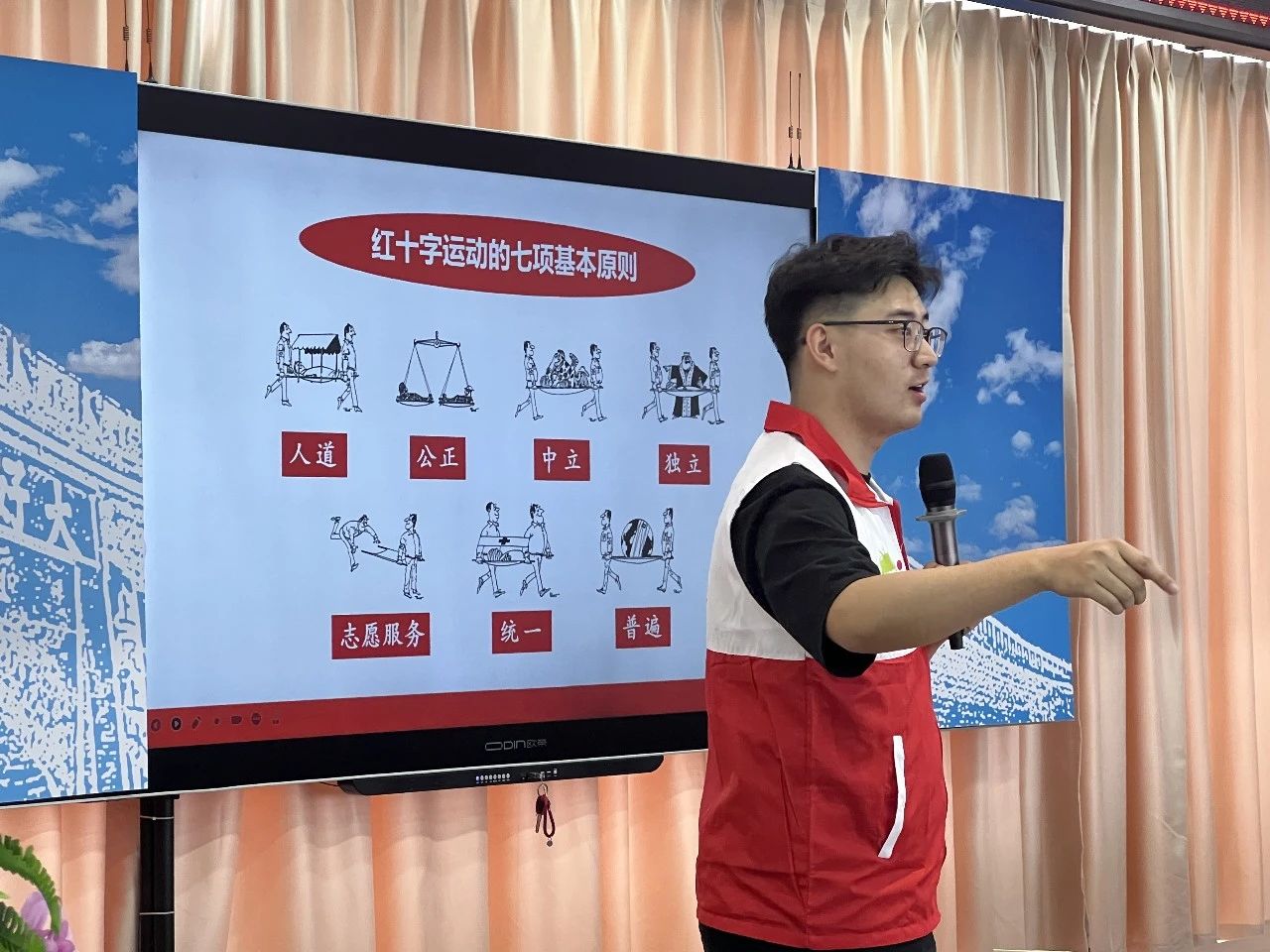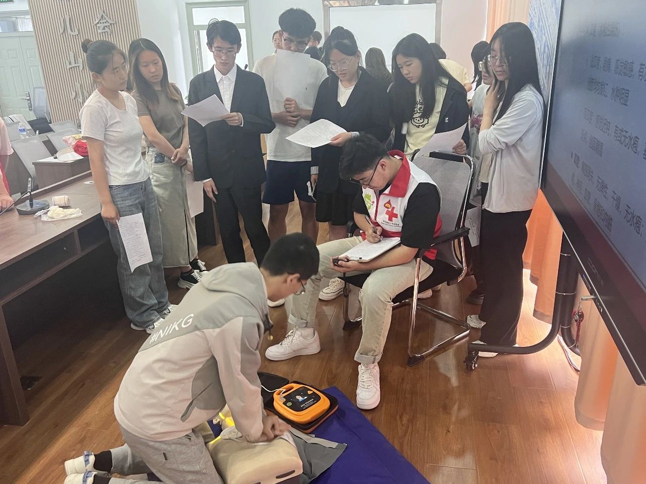 张家口市红十字应急救护志愿服务队在2023年6月11日,开展了第一期红十字救护员认证培训暨张家口市红十字初级普及讲师选拔活动。经过培训使学员们了解红十字运动的基本知识,树立红十字人道救护理念,掌握心肺复苏及创伤救护等初级救护知识和技能。共有70名学员通过理论考试和实操考试,获得红十字救护员资质。       在初级普及讲师试讲环节中,10余名志愿者们将提前准备的急救普及试讲课件,通过现场试讲的形式表达,使初级普及讲师选拔工作推向新的高度。