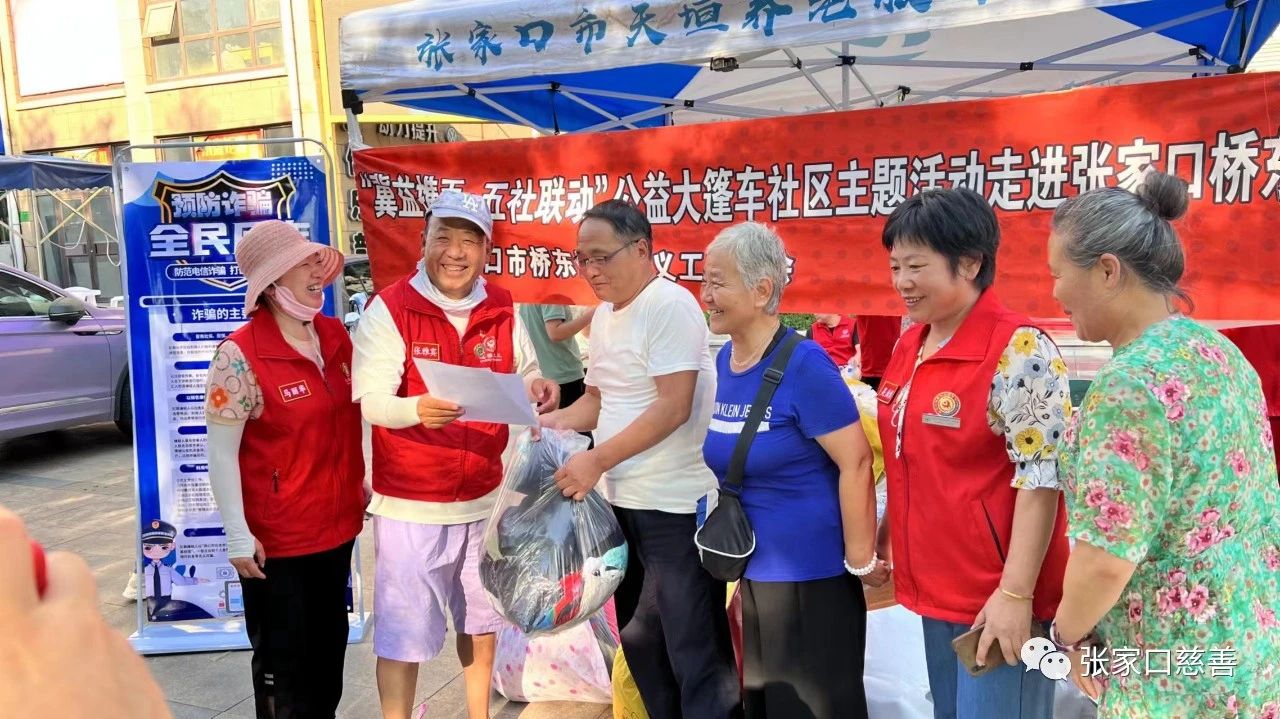 为满足社区居民多元化的文化需求,搭建社区、参与公益的桥梁,以慈善的力量推动五社联动机制在河北落地,在盛夏伊始、万物并秀时节,我会发起了“冀益携手·五社联动”公益大篷车社区主题活动,倡导社区居民通过志愿服务定向捐赠闲置物资,并置换爱心回礼的模式,常态化参与志愿服务和社区治理,共建公益生态型社区。7月24日刚进入中伏,气温居高不下,北师乐缘志愿团队在队长吴浩然带领下,不顾酷暑的炎热,积极响应河北省慈善义工联合会倡导由张家口市桥东慈善义工联合会主办的公益大篷车和反诈骗活动在杨家坟社区金域首府小区拉开序幕。