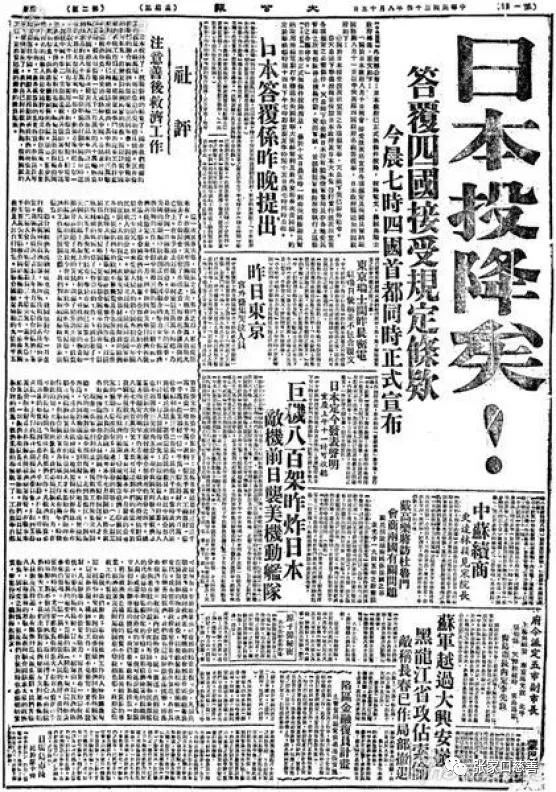 多年前的这 中国几乎所有报纸头版 都用醒目的大字刊出 “日本投降”
