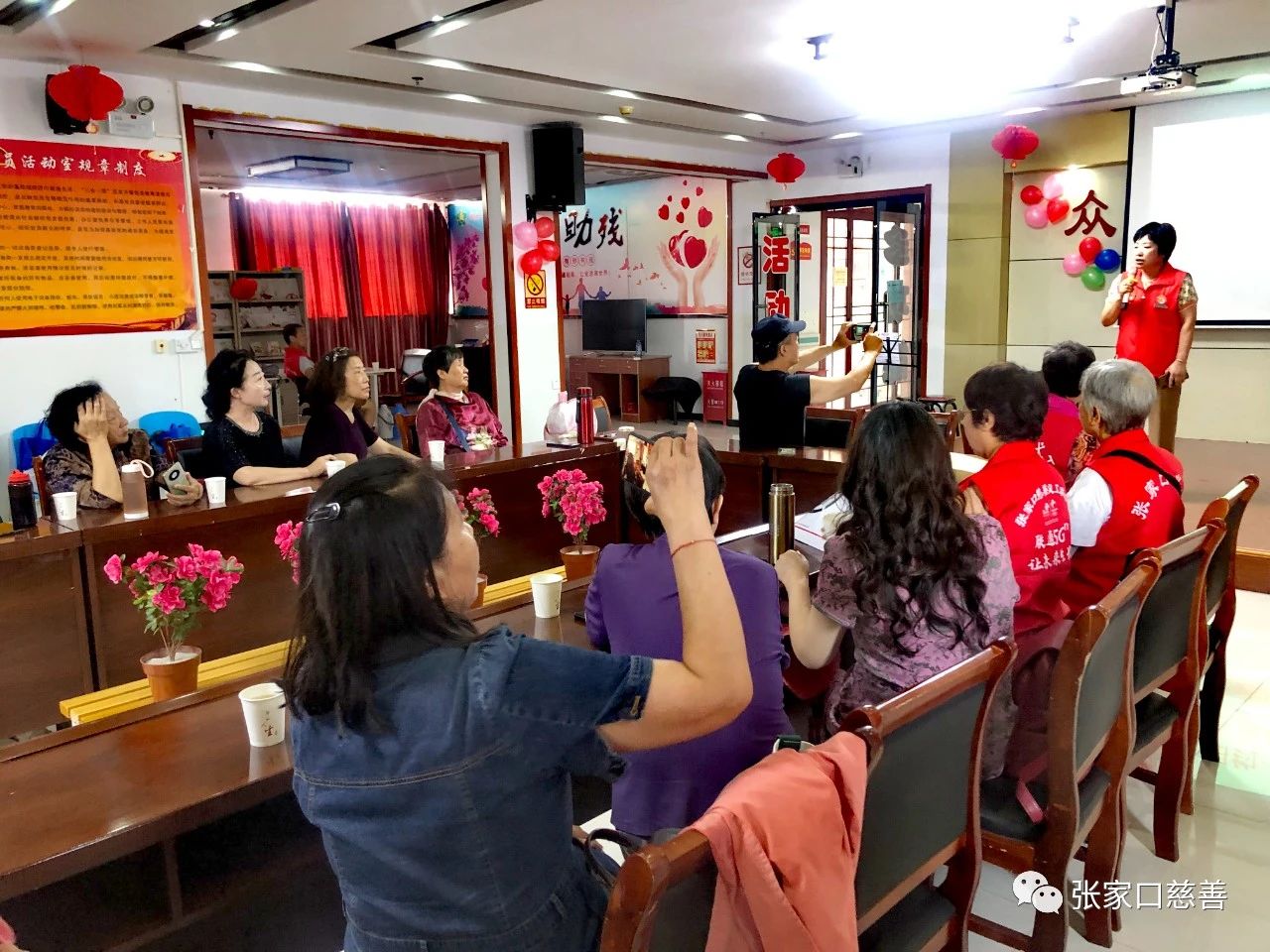 会前志愿者们的手语舞《生命之命》互动让大家增进了彼此的亲近感。此次联欢会是牵手队队长刘玉梅主持,北师乐缘队长吴浩然讲话,感谢大家的到来并希望大家通过这次活动找到心仪的伴侣。张家口慈善义工联合会助老专委会会长、众康生老年公寓院长高海清上台欢迎大家的到来、祝福大家在”七夕”节到来之际寻觅幸福有缘人,并祝有情人”七夕”节快乐!参加联欢会的公益红娘马德生、张继涛、郭素卿和刘玉梅及吴浩然队长依次上台介绍自己,得到了大家热烈的掌声。中老年单身上台自我介绍及其才艺表演,参加本次活动的单身男士9名、单身女士15名。一位70多岁的男士积极上台介绍自己,现场就有人加微信并表示以后要去他的单位实际考察;有位60岁的单身男士的介绍受到了现场许多女士的关注,许多人都加了微信;还有几位男士在现场活动中被人关注会后通过照片打听联系,许多单身女士也踊跃参与自我介绍希望找到意中人。赵炳钓表演的舞蹈《喜事盛门》,艳丽的服装、矫健的舞姿和欢声笑语充满了整个会议室;女士们也不甘落后,有位女士主动上台即兴表演,一曲《梅花赋》舞蹈,舞姿翩翩让人赞叹,引起了阵阵掌声,也许这里就有心动的男士;还有一名单身退伍军人主动介绍自己也引来了阵阵掌声;这次活动还吸引一名女医生,不远千里从外地赶来,希望通过参加联欢活动遇到有缘人。为了拉近中老年们的彼此距离,活动中还增加了《幸福拍拍操》互动环节、全体人员一起在音乐中互相拍背,大家非常开心、增强了现场热烈欢快的氛围。最后,所有人都上台由郭惠君老师手风琴伴奏一起合唱《年轻的朋友我们来相会》合影留下美好的瞬间。中午大家一起就餐,进一步交流,其中有些有意的主动一起就餐,有的还互加微信方便以后联系,衷心的祝福他们有情人终成眷属。