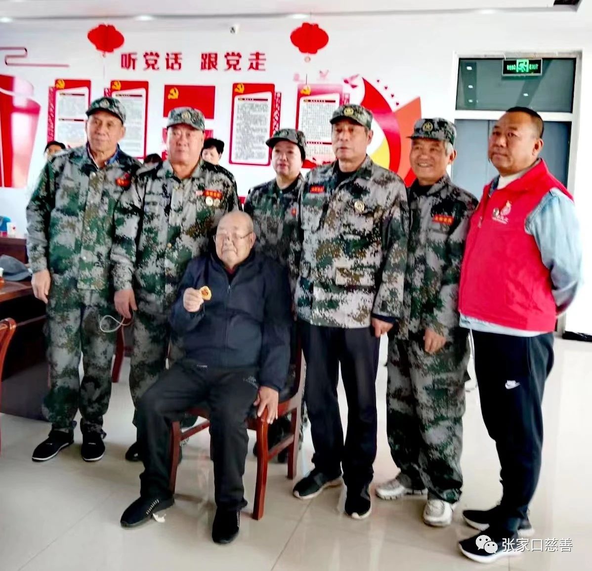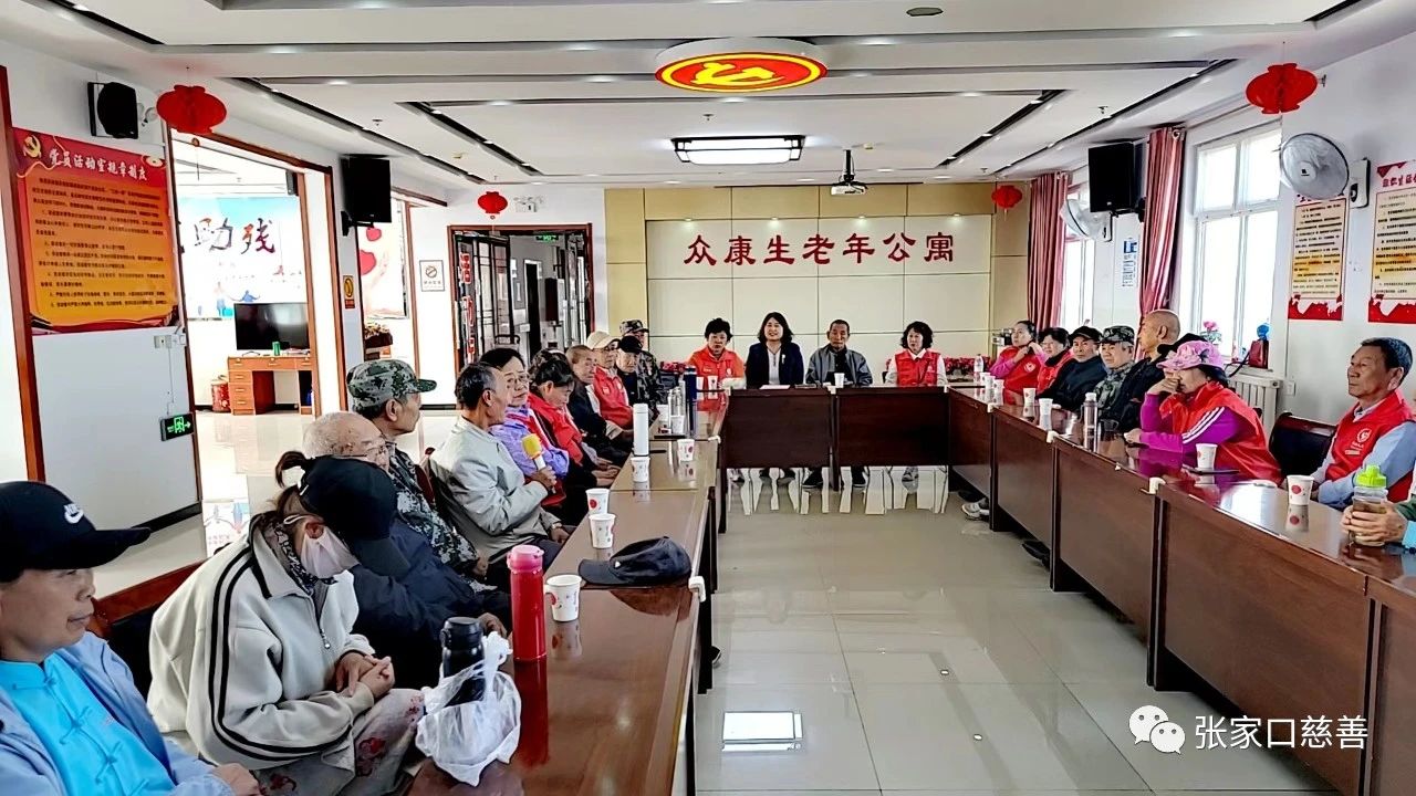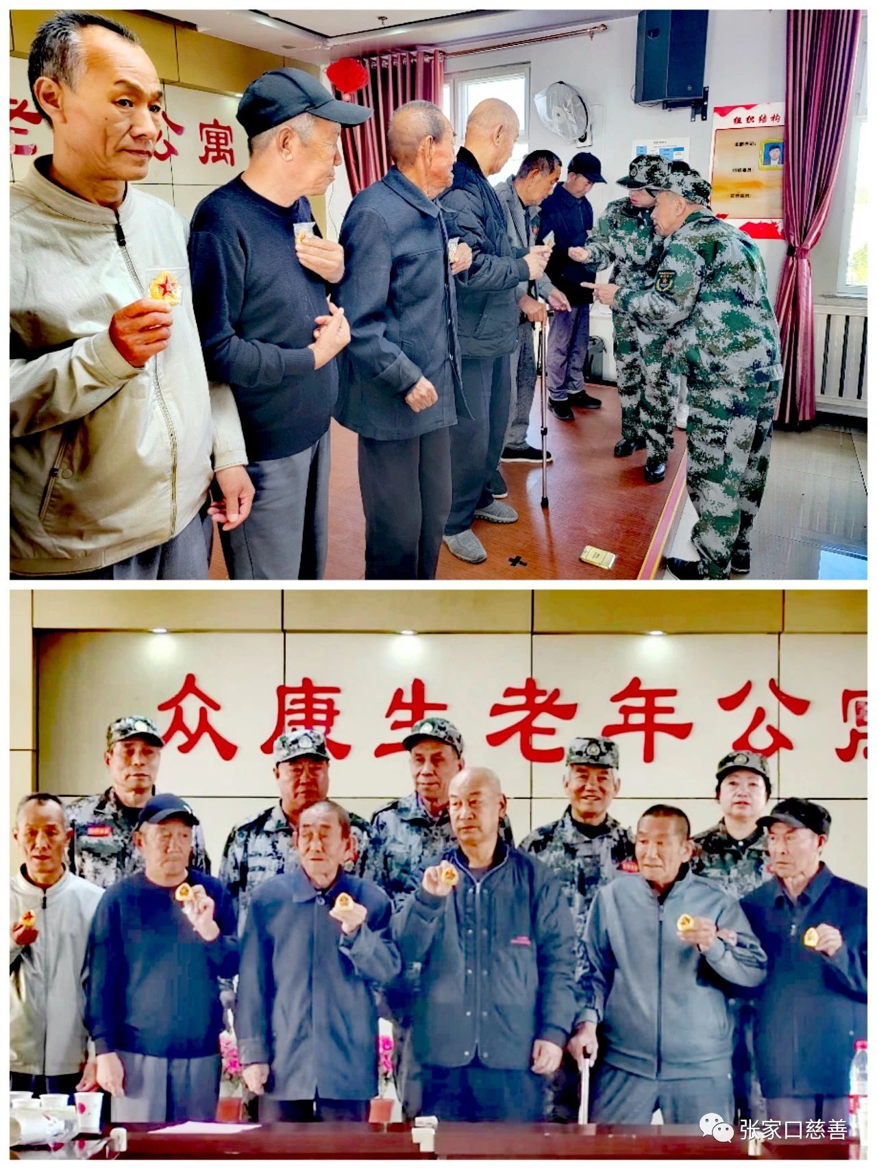 我们进入了干净整洁的众康生养老中心,受到院长高海清的热情接待,她把我们领进养老中心四楼活动室,部分退役老兵已经安排好,看到我们进来,他们以军人的最高礼仪—军礼,欢迎对我们的到来,表示由衷的感谢。高海清不仅是众康生养老中心的院长,她也是张家口市慈善联合会助老专委会的会长。首先,她在“双节”期间对退役老兵表达了真挚的问候,也对北师乐缘志愿者的到来表示了真诚的谢意;随后,北师乐缘义工之家队长吴浩然为退役老兵送上了节日的祝福,感谢他们为祖国无私的奉献,祝福他们生活幸福快乐;北师乐缘老兵队队长张国祥向各位退役军人老班长致以节日的问候并送上纪念品,祝他们身体健康、福如东海、寿比南山。