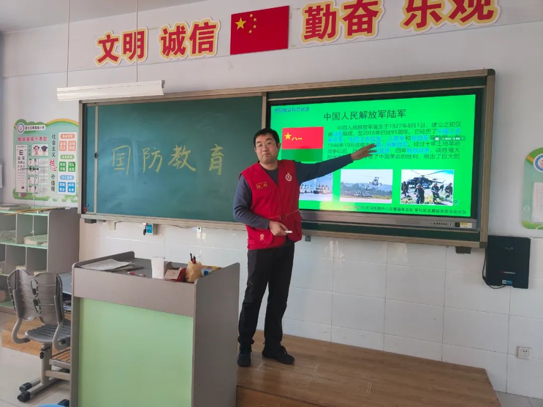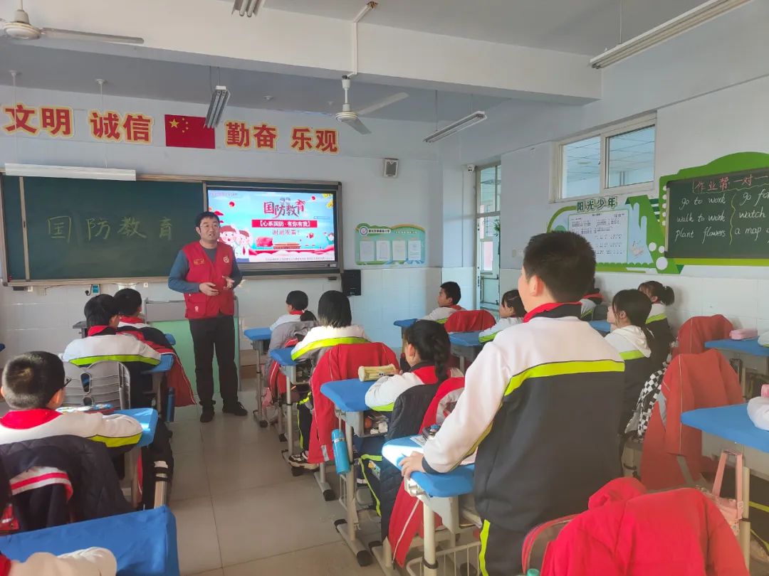 党员志愿者宿磊积极贯彻党的二十大报告指出的“深化全民国防教育”,以PPT的方式,声情并茂地为师生们讲解了“国防是什么”“国防教育的意义是什么”“人民解放军有哪些军种”“人民解放军现代化军事装备知识”四个方面的内容,引导同学们认识到国防建设的重要性和紧迫性,坚决担负起未来保卫祖国的历史使命,真正成为爱党、爱国、奋进自强、勇于担当的新时代好少年。