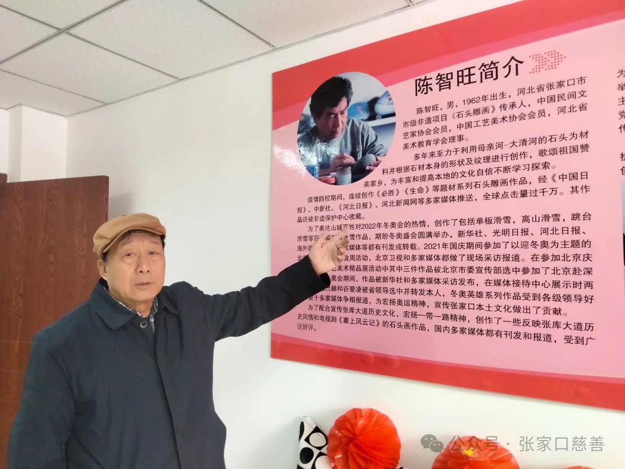 福德仁爱公益队艺术团团长张伟讲述陈智旺的石头画 陈智旺是河北省张家口市级非遗项目石头雕画传承人,中国民间文艺家协会会员,中国公益美术协会会员,河北省美术教育学会理事。陈智旺利用张家口的母亲河——清水河的石头为原材料,根据石头本身的形状及纹理进行创作,歌颂祖国,赞美张家口的大好河山,连续创作了多门类的石头画作品,包括:疫情防控、冬奥风采、张库大道、英雄谱、龙年吉祥等作品。