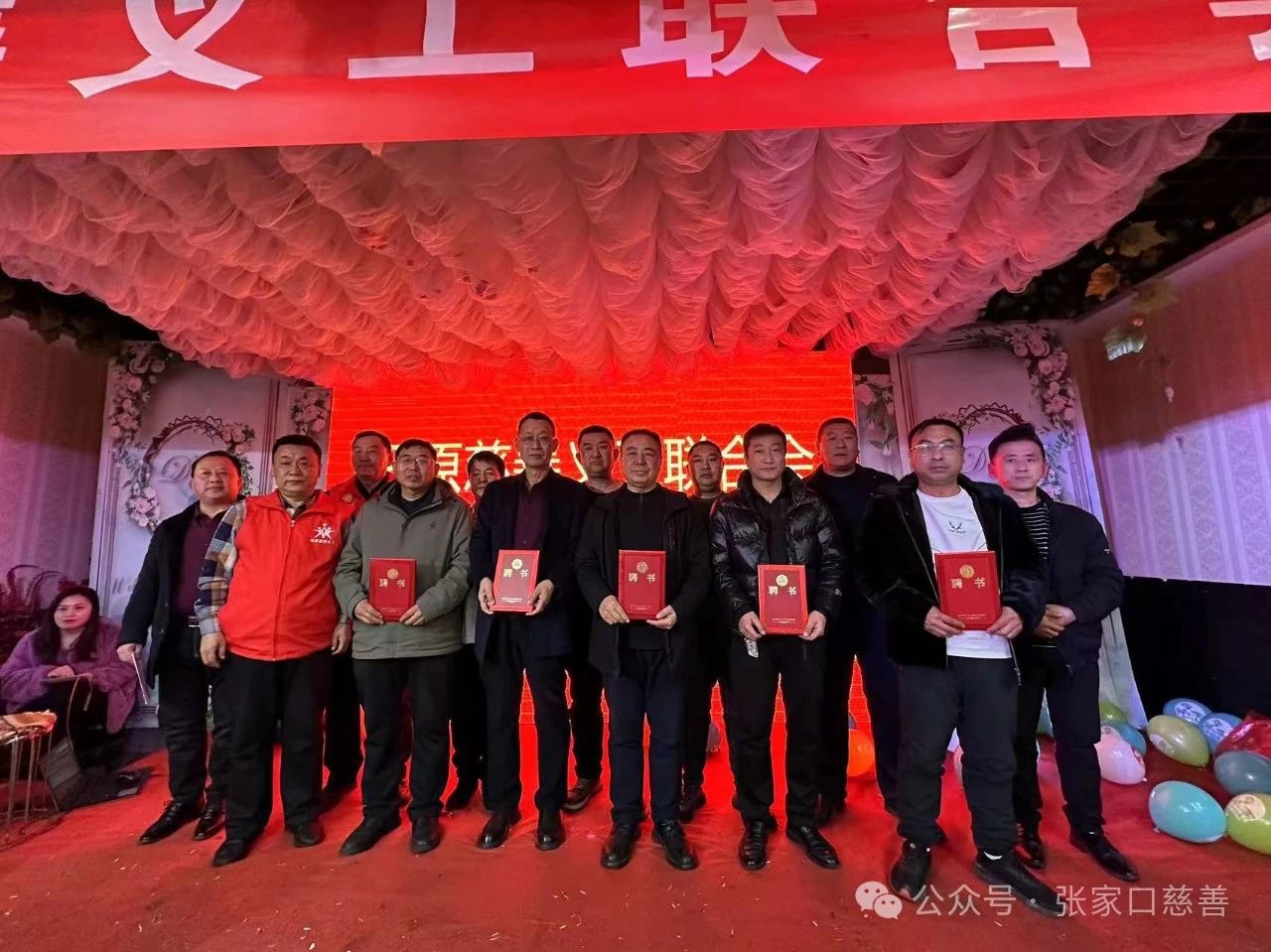 刘会长宣布高培科、常连永、王建强、王建文、陈艳平、肖志祥六位爱心企业家被聘为阳原慈善义工联合会荣誉会长并集体颁发聘书。