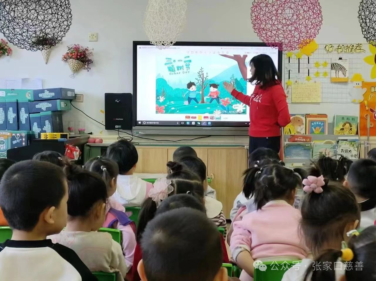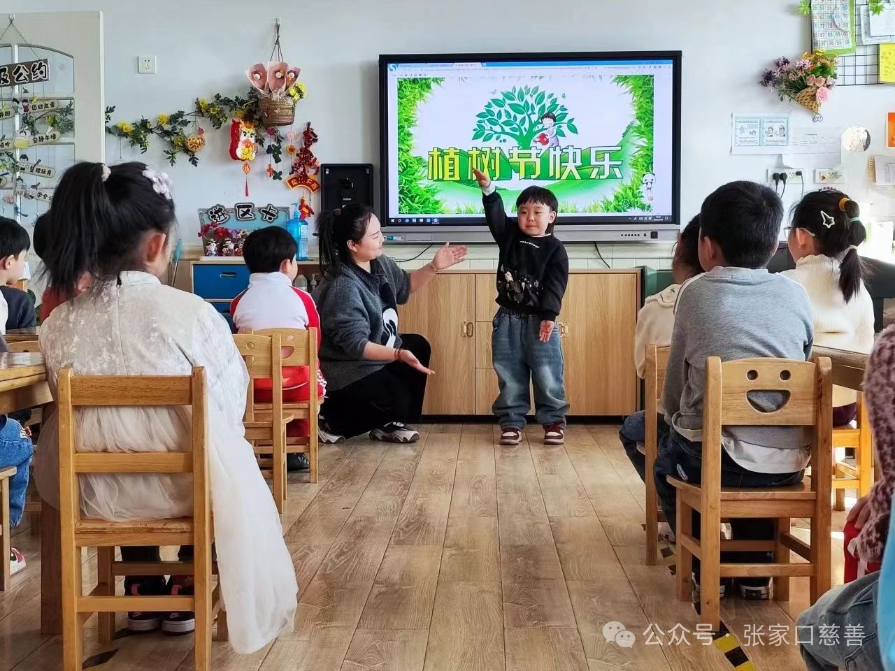 2024年3月12日,白鹭环保志愿者王英娟在张家口市桥西区民族幼儿园组织全园师生开展“绿满春天 植此青绿”植树节主题宣传活动。