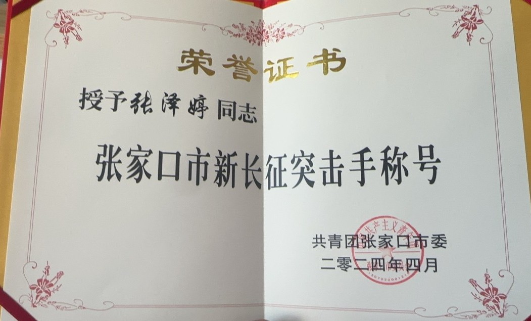 【喜报】恭喜张泽婷、郑之星两名同志荣获张家口市新长征突击手称号