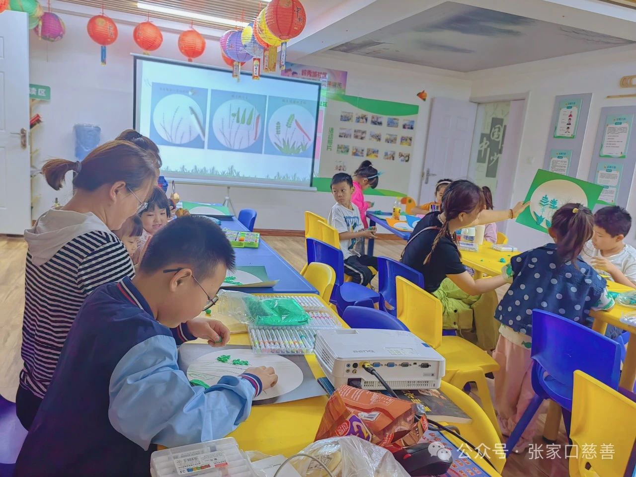 接着,亲子绘画活动正式开始。活动现场,专职老师还为孩子们准备了丰富的绘画材料和工具,让他们能够尽情发挥。孩子们用超轻粘土制作小麦、彩笔画小麦,沉甸的麦穗惟妙惟肖,一束束绿油油的麦子像在跟我们点头,告诉我们“小满来啦”!