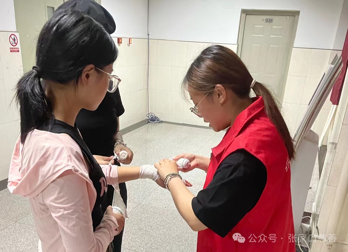 培训活动中,队长赵元绮将队员分成10组,每组由6名队员组成。讲解如何进行绷带的使用,如何掌握绷带包扎法。包扎是外伤急救处理最常用的外科治疗手段,是应用各种包扎材料覆盖或固定患处,在急诊和院前急救中应用广泛,可以保护伤口,防止组织粘连。绷带包扎法是最普遍的一种伤口包扎法,主要包括环形包扎法、螺旋包扎法、“8”字包扎法和回返包扎法。志愿者们专心听课、认真记录,相互进行了实践操作。