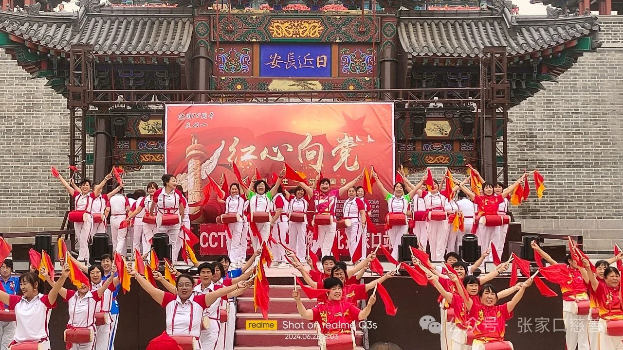 2024年6月22号下午三点为庆祝中国共产党成立103周年,由张家口市万全区文学艺术界联合会(指导),万全区红歌协会主办,张家口元红文化传媒有限公司承办,协同万全区城乡文化旅游发展有限公司,CCTV全球爱华春晚河北省张家口站。张家口元红文化传媒有限公司,万全区红歌舞蹈队,张家口市桥西星辰合唱团,万全区春之韵無蹈队,万全一家亲太极队,万全姐妹舞蹈队,莲之韵舞蹈队,丽景丽霞舞蹈队,万全星舞蹈队,演员齐聚张家囗市万全区右卫城文艺汇演,集体百人腰鼓舞:中华全家福,受到各界领导和观众的好评。春之韵舞蹈义工队还演出了舞蹈(亲吻祖国)大家都是非常喜欢。庆祝中国共产党成立103周年。
