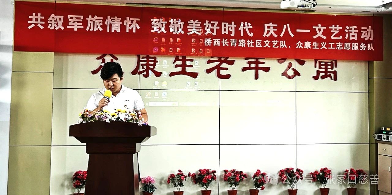 首先,众康生老年公寓副院长张浩然为庆祝“八一”建军节主题活动致词,希望通过这次慰问演出活动,来表达我们对退伍老兵的敬意和关爱。因为您们是国家的脊梁,是民族的英雄。在八一建军节即将到来之际,我代表众康生老年公寓向您们致以最崇高的敬意,愿他们的晚年生活幸福安康。