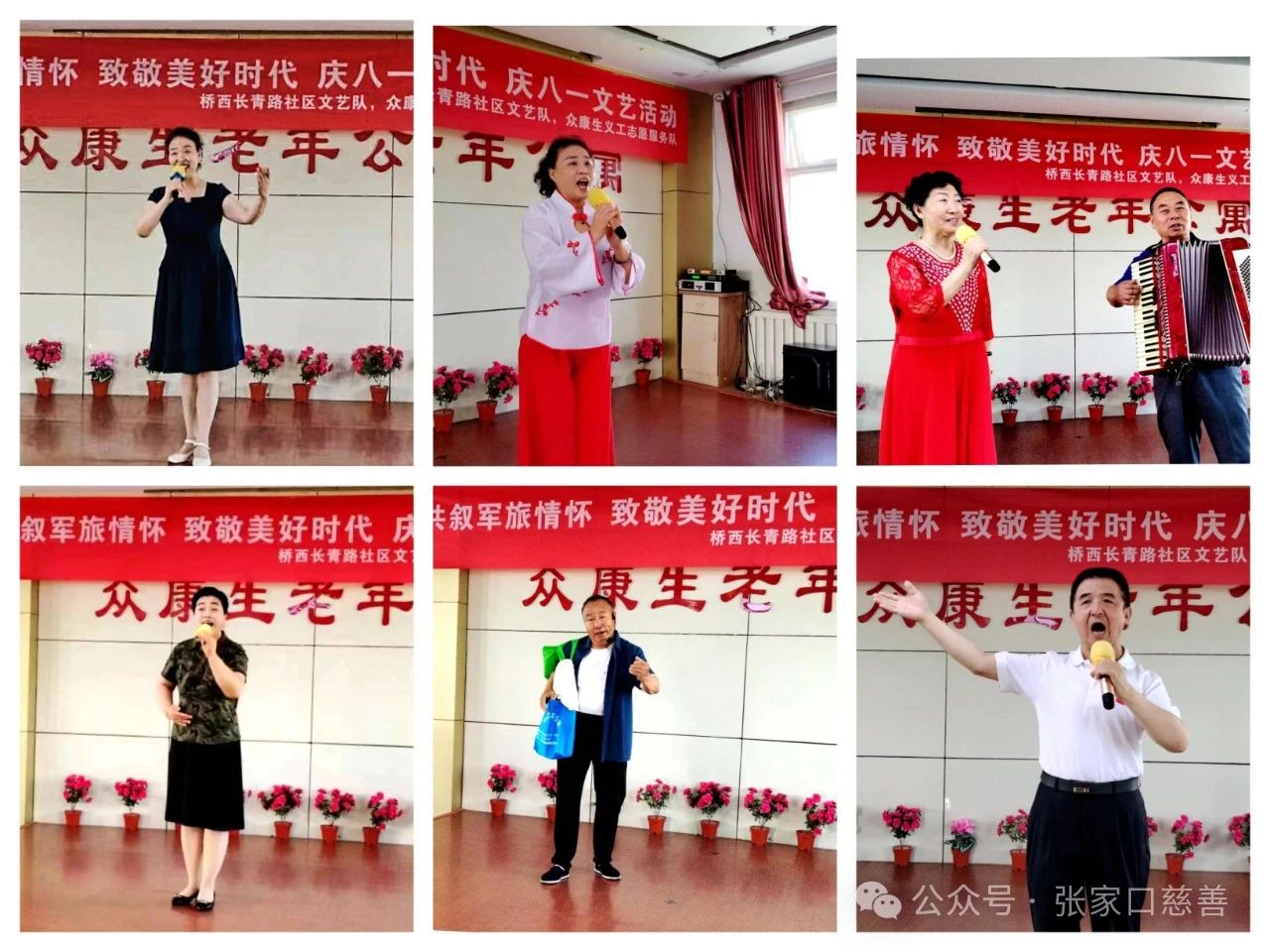 接下来众康生义工志愿服务队、桥西长青路社区文艺队的志愿者朋友们为老兵们献上了精彩的文艺节目。独唱《军人的本色》、《爱永在》、《祝福祖国》、《我们的中国梦》、《珊瑚颂》,男女生二重唱《当你的秀发拂过我的钢枪》和女生二重唱《望星空》、《绒花》、军歌联唱《中国人民志愿军赞歌》、《红星歌》,男小合唱《莫尼山》,舞蹈《红枣树》等军旅题材、歌唱祖国的优秀节目轮番上演,她们的精彩表演赢得了现场老兵和观众的热烈欢迎和掌声!最后,在全体演职人员和现场退役老兵及工作人员的大合唱《没有共产党就没有新中国》声中,“共叙军旅情怀,致敬美好时代”暨庆祝“八一”建军节主题活动落下了帷幕,这铿锵有力的嘹亮歌声,唱出了中国共产党全心全意为人民服务的宗旨,唱出了人民群众忠于党、热爱党的心声!