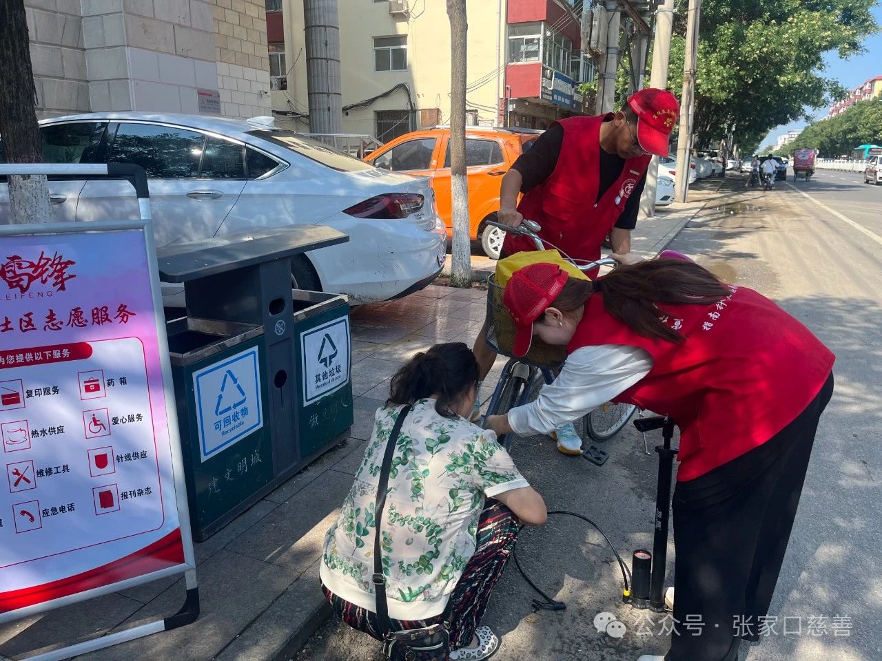 在队长赵忠的带领下,志愿者们早早地来到了活动现场,准备为居民们提供贴心的服务。他们分工明确,有条不紊地展开工作……活动现场,最受欢迎的当属自行车打气服务。