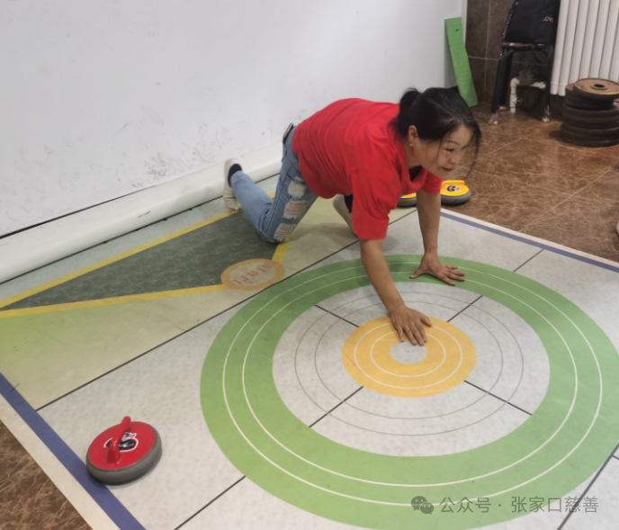 上午八点半,大家陆续到活动室集合。分组后,两组队员开始进行热身活动,边讨论战术,边练习推壶。之后在海豚志愿服务队队长霍振玲的组织下,大家进行了一场旱地冰壶友谊赛。现场的每位队员都非常认真得对待每一次推球机会,尽可能占据有利位置,为本组拿到分数。