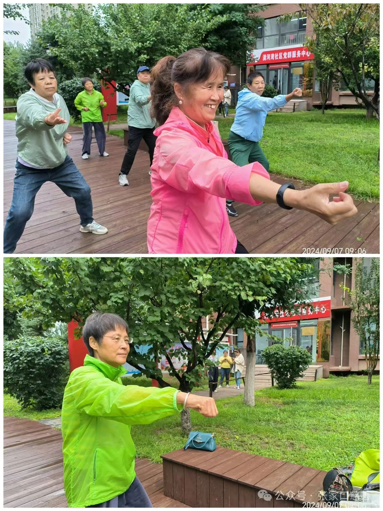 天公不作美,但小雨并没有阻挡大家的热情:健身球依然甩的有力,八段锦也不急不缓,健身操更是充满了活力,大家的每个动作都尽可能到位,甚至比在活动室的时候还要整齐划一。这种热情也吸引了社区的居民,他们加入进来,和我们的队员一起切磋比划,好不热闹。细雨中健身,也是属于海豚妇女儿童之家特有的浪漫了。