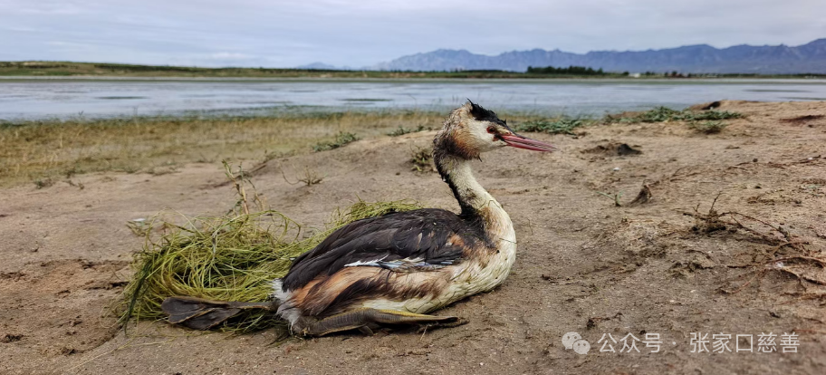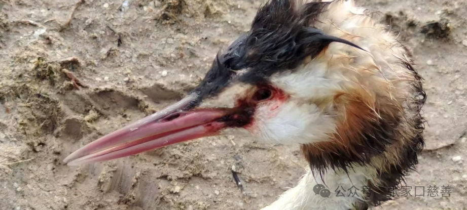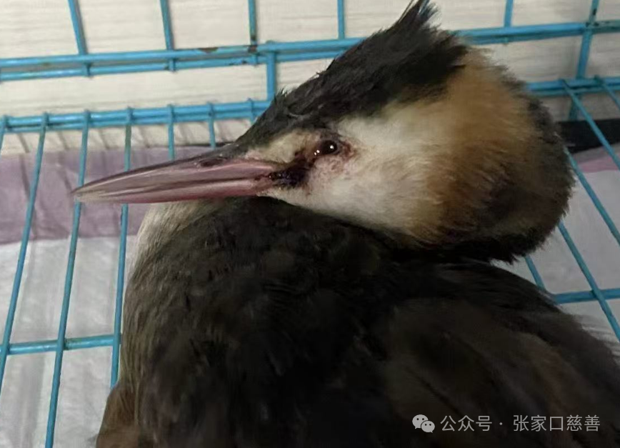 眼下正是鸟类迁徙季节,也是鸟类受伤害多发季节。在野生动物救护过程中,鸟类救护约占整个野生动物救护数量的60%以上。鸟类是人们生存环境的检验员,善待鸟类,也就是善待我们自己。2024年9月11日,阳原野生动物救助中心副理事长张亚峰在辛其水库西北角发现一只受伤的鸟,被渔网缠绕。经确认,此鸟为凤头??,雌鸟,亚成鸟。精神状态欠佳,无法站立、行走、飞行,无法潜水,身体虚弱,左眼,左嘴角受伤。张亚峰开好接受证明后,随即将此鸟带回救助中心治疗,待到凤头鸊鷉伤势痊愈,符合放飞条件后,再将其放归大自然。
