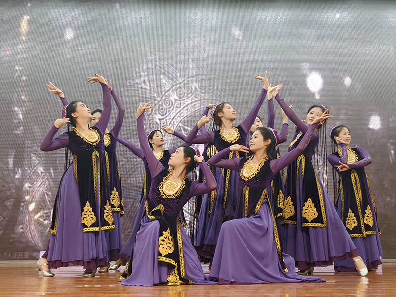 舞蹈表演中,古典舞《莲叶》宛如一幅优美的水墨画缓缓展开。舞者们身着飘逸的古装,身姿婀娜,舞步轻盈,似一片片莲叶在微风中摇曳生姿。她们用细腻的肢体语言,演绎出江南水乡的温婉与柔美,将传统文化的韵味展现得淋漓尽致。台下观众沉浸其中,被古典舞的独特魅力所折服,不时爆发出阵阵掌声和赞叹声。在这个充满现代气息的舞台上,古典舞《莲叶》如同一股清泉,流淌着千年的文化底蕴,让青年们感受到了传统文化的博大精深和独特魅力,激发了他们对传统文化的热爱与传承之情。 当欢快的音乐响起,舞蹈《跳吧,古丽》闪亮登场。舞台上,身着色彩艳丽新疆服饰的舞者们踏着轻快的节奏,尽情舞动。她们的裙摆飞扬,像绽放的花朵;眼神灵动,似闪烁的星辰。旋转、跳跃、扬眉、甩头,每一个动作都充满着浓郁的西域风情,将新疆舞蹈的热情奔放展现得淋漓尽致。热烈的舞步与灿烂的笑容相互映衬,传递出对美好生活的热爱与向往,也让现场观众感受到了中华民族多元文化的魅力,赢得了阵阵欢呼与掌声。