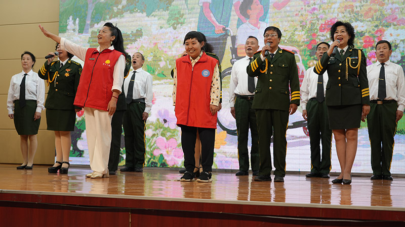随后,朗诵节目《这盛世如您所愿》将现场氛围推向庄严而深情的高潮。朗诵者们身着正装,神情庄重,站在聚光灯下,用饱含深情的声音,将一段段跨越时空的对话娓娓道来。从革命先辈们为了民族独立和人民解放抛头颅、洒热血,到如今中国在经济、科技、文化等领域取得的辉煌成就;从曾经积贫积弱的旧中国,到如今繁荣昌盛、屹立于世界民族之林的东方大国,字里行间满是对先辈们的缅怀与致敬,以及对当今盛世的自豪与感恩。随着朗诵的推进,激昂处,声音铿锵有力,如黄钟大吕,震撼人心;低缓时,语气轻柔婉转,似潺潺溪流,触动心灵。现场观众们神情专注,许多人不禁红了眼眶,仿佛与朗诵者一同穿越历史长河,见证了中华民族从苦难走向辉煌的伟大历程,更加深刻地体会到今日幸福生活的来之不易,也坚定了传承先辈精神、为实现中华民族伟大复兴而奋斗的决心。 当《爱的奉献》的旋律响起,全场气氛达到新的高潮。上谷阳光艺术团的成员们身着统一服饰,深情开唱。温暖的歌声中,饱含着对无私奉献精神的赞颂,对人间大爱的深情呼唤。而在舞台一侧,宣化区残疾人发展促进会会长耿素霞优雅地用手语同步演绎。她的每一个动作,都精准而富有感情,指尖舞动间,无声却有力地诠释着歌词中的每一份温暖与善意。随着歌曲推进,耿素霞会长的手语动作时而轻柔舒缓,如春风拂面,展现出爱的细腻;时而坚定有力,传递出奉献的力量,与歌声完美交融,让这首经典歌曲焕发出全新的生命力。