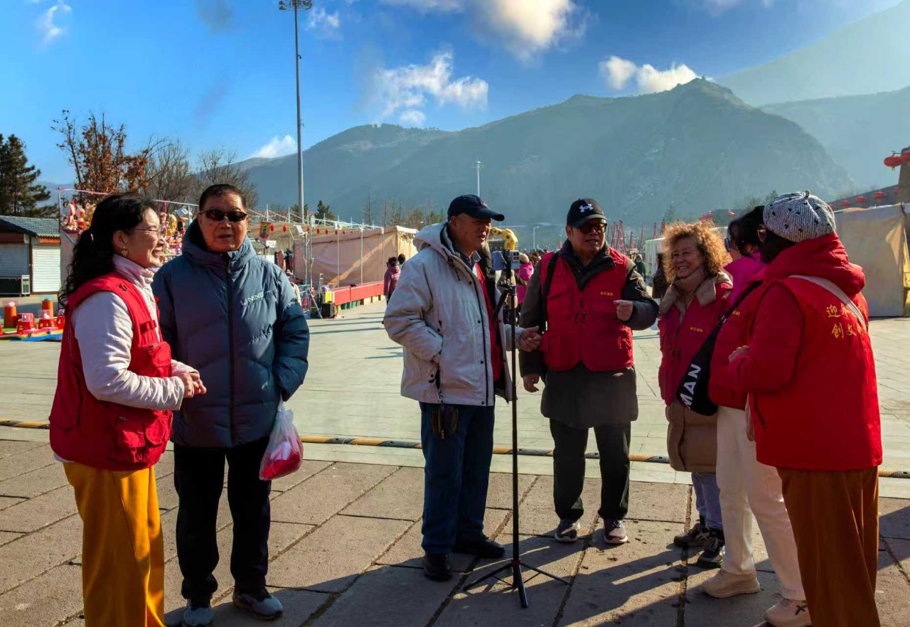 大境门长城下,红灯高挂映春意,志愿者们身着统一红马甲,精神饱满、笑意盈盈。活动现场,大家分工协作,有的手持相机记录彼此的笑容与节日氛围,有的互相整理着装、分享拍摄技巧,平日里专注于公益摄影的志愿者们,此刻化身镜头前后的主角,在长城脚下留下专属合影。