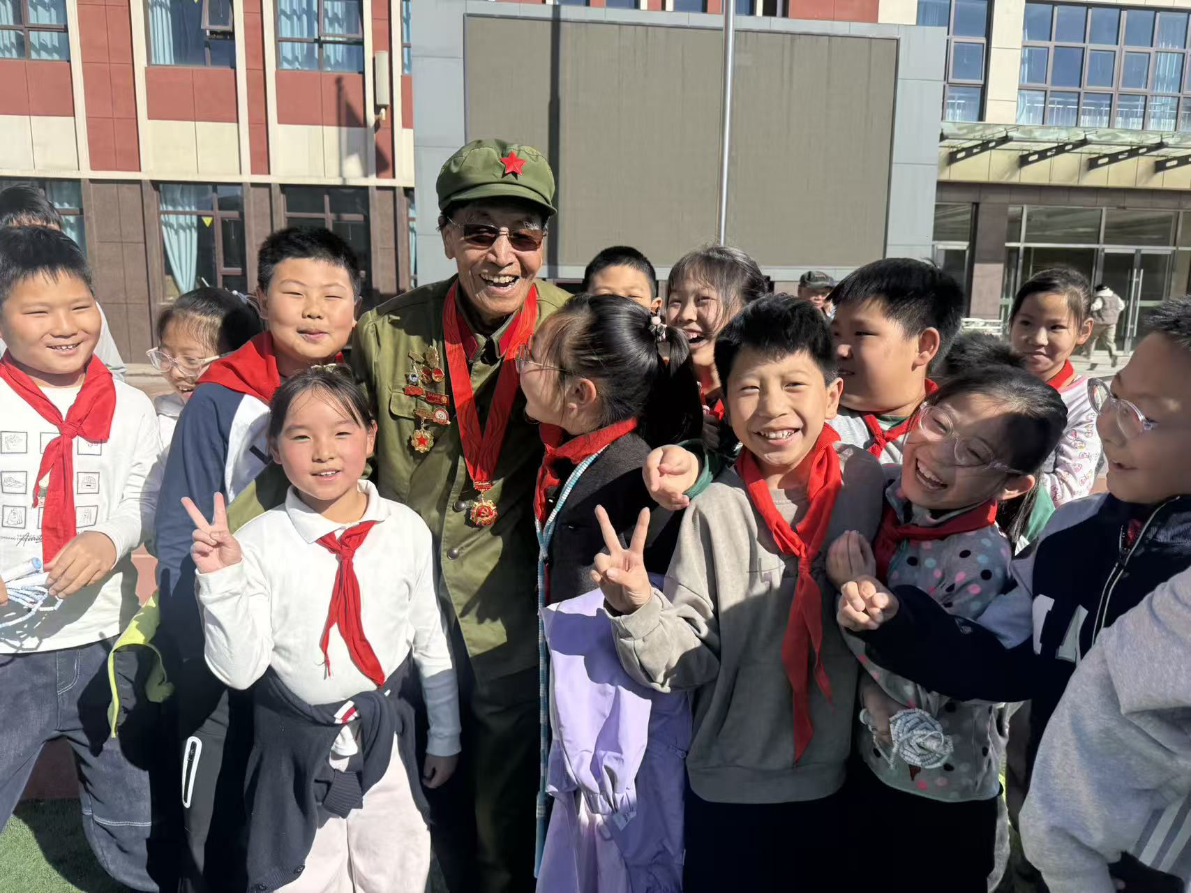 活动现场氛围庄重肃穆,少先队员们身着整齐校服,佩戴鲜艳红领巾,以崇敬的目光迎接李书庭爷爷的到来。活动伊始,全体师生肃立,向罗阳烈士默哀,表达对这位为国捐躯英雄的深切哀思与崇高敬意。 随后,李书庭爷爷结合罗阳烈士的生平事迹与爱国奉献精神,为孩子们展开深入浅出的讲解。他用朴实真挚的语言,讲述了罗阳同志一生坚守航空报国信念,为我国航空事业呕心沥血、鞠躬尽瘁,直至生命最后一刻仍奋战在工作岗位上的感人事迹,生动诠释了“忠诚、执着、担当、奉献”的英雄品格。作为有着丰富爱国主义教育经验的义务讲解员,李书庭爷爷还结合察哈尔烈士陵园的红色故事,将革命先烈的爱国精神与罗阳同志的报国情怀相融合,引导孩子们深刻理解爱国主义的内涵,明白今天的幸福生活来之不易,更懂得少年一代肩负的责任与使命。