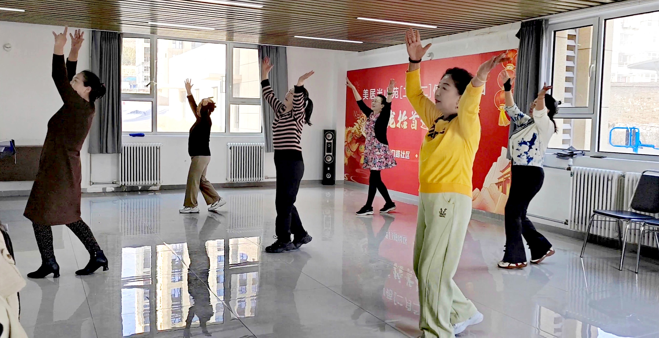 参与活动的银龄队员们个个精神饱满、热情高涨,丝毫没有因年纪增长而显露懈怠,全程专注投入、认真练习,展现出极强的学习积极性。伴随着悠扬又激昂的音乐旋律,大家缓缓舒展身姿,跟着老师的节奏一遍遍揣摩动作细节,反复磨合舞步与音乐的配合。遇到不懂的地方,队员们主动举手向老师请教,身边的伙伴们也纷纷伸出援手,互相纠正动作、交流学习心得,你帮我捋手势,我帮你找节奏,团结友爱的学习氛围深深感染着在场每一个人。即便练习过程中有些疲惫,队员们也始终坚持,凭借着认真的态度和彼此间的默契配合,很快便熟练掌握了舞蹈的核心动作与整体编排。整齐划一的舞步、深情真挚的演绎,队员们将对祖国的无限热爱、对美好生活的感恩,全都融入每一个舞姿之中,生动展现出新时代老年群体乐观向上、心系家国的良好精神面貌。