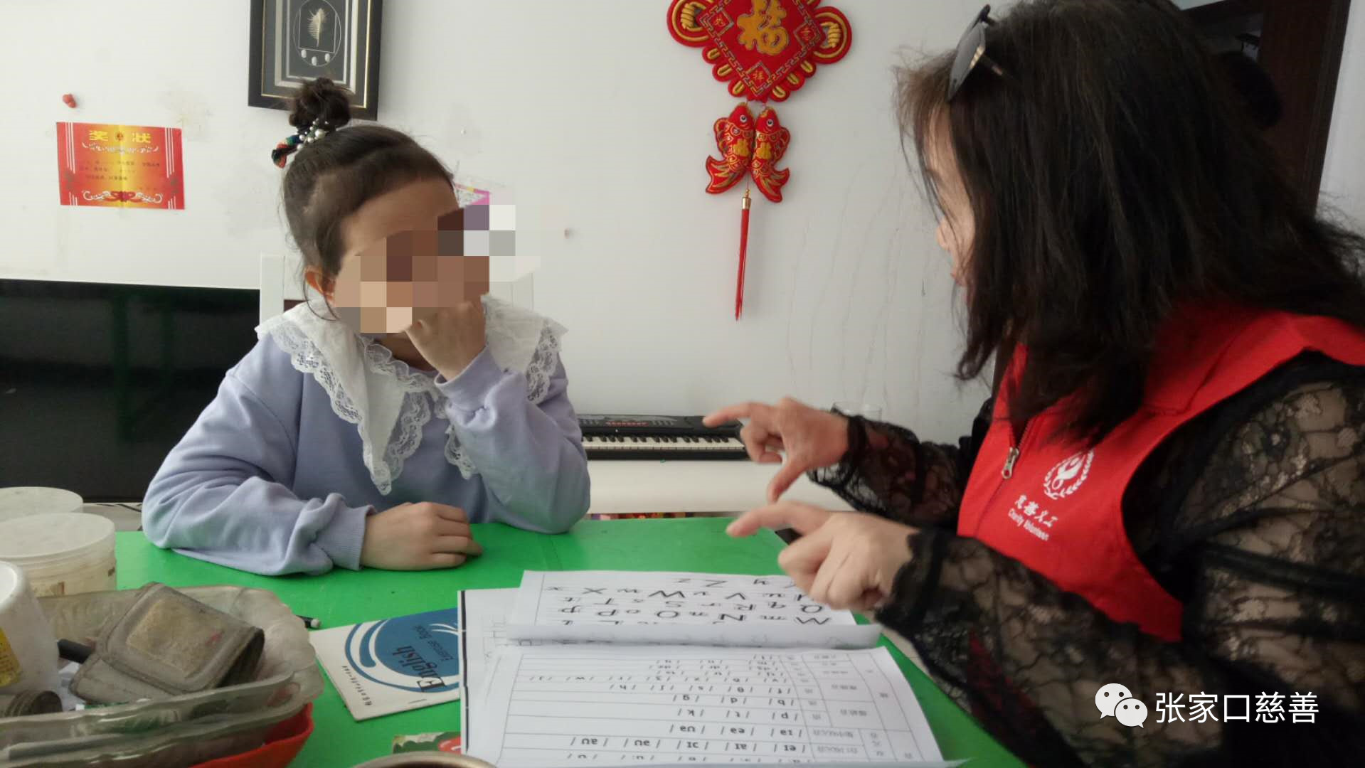 下午2:30北师乐缘义工队一行四人在队长吴浩然的带领下来到赵某家开展志愿服务活动。刚从美国回国的田华教授从2006年到美国加州伯克利大学做访问学者时就经常参加当地的慈善活动,这次田教授刚从美国回来就积极联系北师乐缘义工队,表示愿参加志愿服务活动。在赵某同学家田华教授首先和孩子的家长进行了沟通,希望共同对孩子进行"爱心、感恩、礼貌"思想品德进行教育。然后田教授耐心、细致地为孩子讲解课业,纠正孩子在发音、书写上的错误,田教授还把从美国带来的美国教授赠送给她的一幅极珍贵的手写字母表转赠给赵同学,并题字留念,激励赵某刻苦学习。经过田教授面授,赵同学的英文写、读有了提高,鉴于当天是母亲节,田教授悉心教会了赵某用英语向妈妈祝福的话,当赵某用标准的美语对妈妈说Happy mother" Day时,赵某的妈妈激动得热泪盈眶,母女紧紧地拥抱在一起,看到这温馨的场面,我们都动情地注视着她们幸福的一刻。赵某现就读于清河路小学二年级,其父亲于二零一六年底因车祸亡故,其母贾女士八年前因脑溢血做开颅手术,留下后遗症,至今生活不能自理,生活极度贫困。