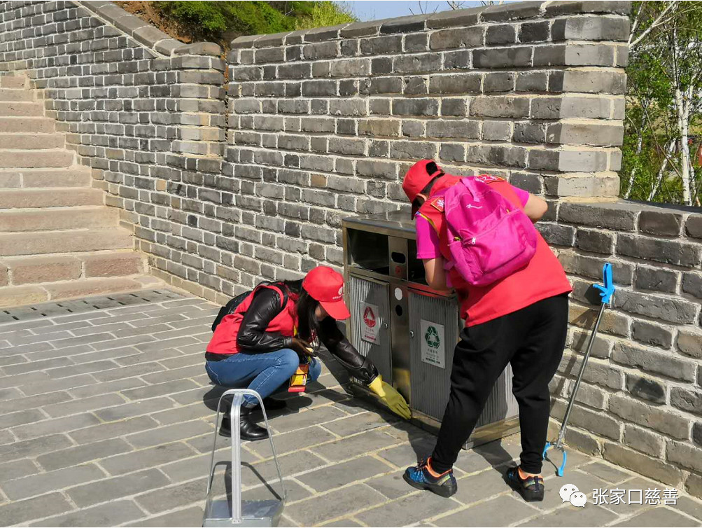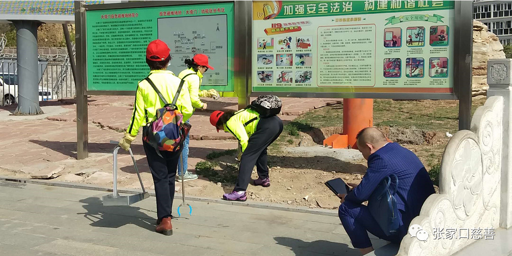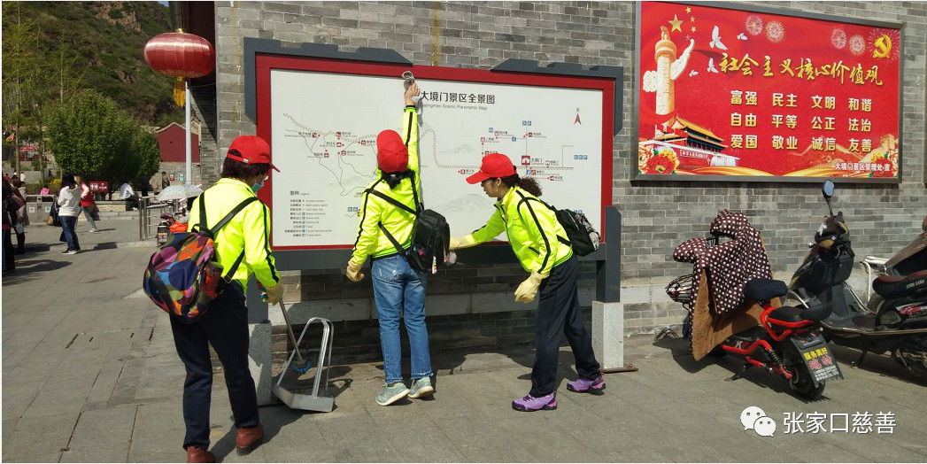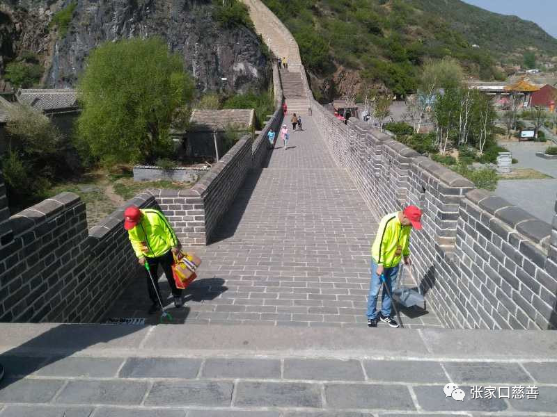 今天我们黄丝带志愿者之家为助力创城,在霍焰队长的带领下一行11人来到了大境门景区。我们定的时间是九点,但老师们8:40分都穿着整齐的队服来到了广场。霍队向景区负责人领到了工具,简单的给大家分配了任务,为了照顾岁数大的老师。霍队带领骆建波、李秀英、方妍斐三位老师登上了长城清洁垃圾。广场上王志宏带领六位老师兵分两路。王小泽、杨文秀、耿淑华三位老师从北面向东,闫秀芬、王桂香、杨金云从广场南面向东,她们两组都认真的擦着每个垃圾桶、广告牌和护栏的尘土。到了广场东面汇合后大家一字排开,从广场东面向西把广场地面上垃圾、纸屑、烟头、杂物全部捡拾干净。今天广场上的人比较多,除了游客有拍电影的娃娃们、有17中的学生们、还有春雷老年公寓的工作人员带领的老人们来到广场提前给老人们庆祝母亲节。我们的老师们不厌其烦的一遍一遍地捡着地上的垃圾。17中的同学们,和春雷老年公寓的老人们看到我们的善举都为我们点赞!