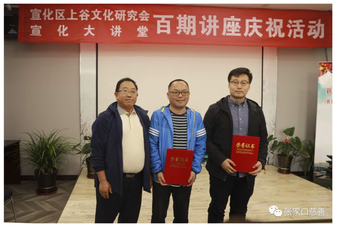 接下来颜诚副会长主持大讲堂百期庆典活动。首先顾建中会长回顾了两年来的风风雨雨,坚持与坚守。从一期到百期有各级领导的鼎力支持,大讲堂是聚英堂汇聚了众多精英老师无私奉献,内容有国学、历史、文物、教育、民俗、中医、书法等等涉猎之广令人瞠目,并参与社会公益活动,组织志愿者团队,进行了一系列的公益活动。并出版书籍《千年古郡宣化》和《上谷文化》期刊。携年画续佳话,扬正气编百题。奋斗永在路上,进取未有穷期。