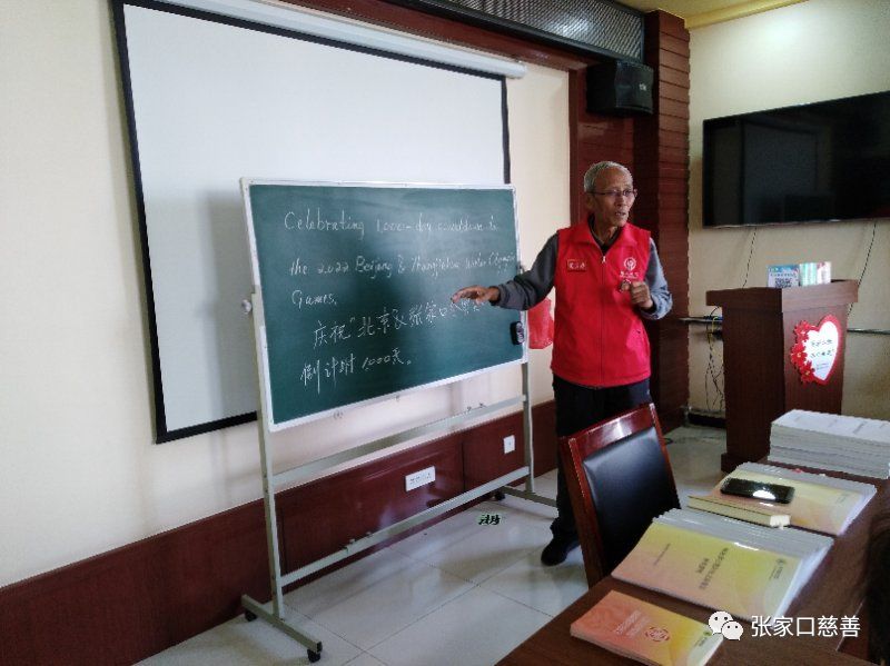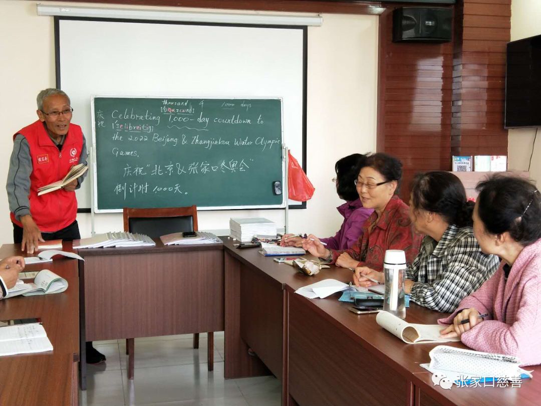 2019年5月4日上午,张家口慈善义工联合会冬奥英语老年志愿服务队英语培训班在长宁街社区进行第80次活动。内容为纪念五四青年节100周年纪念日和学习英语句子‘’ Celebrating 1000-day countdown to the 2022 Beijing Wintet Olpmpic Games “.庆祝北京冬奥会倒计时1000天。(5月11日是倒计时1000天)。