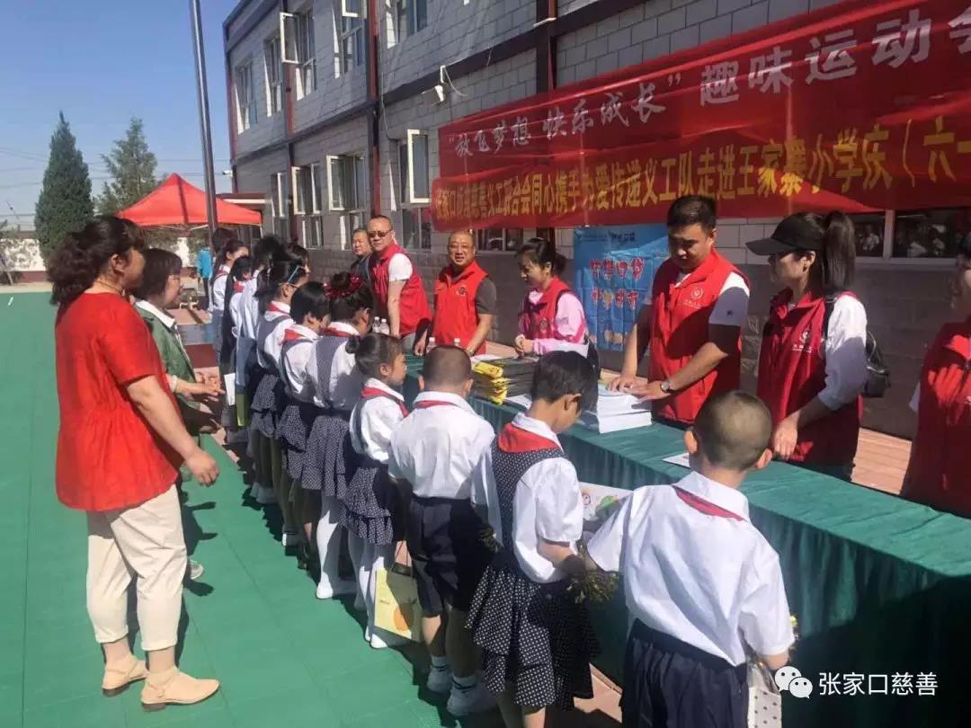 2019年5月31日早上,张家口市桥东区慈善义工联合会同心携手为爱传递义工队在队长李军的带领下一行10人走进王家寨小学和孩子们共同过六一,现场捐出梦想口袋字帖200份,学习用品13份,每份价值100元。