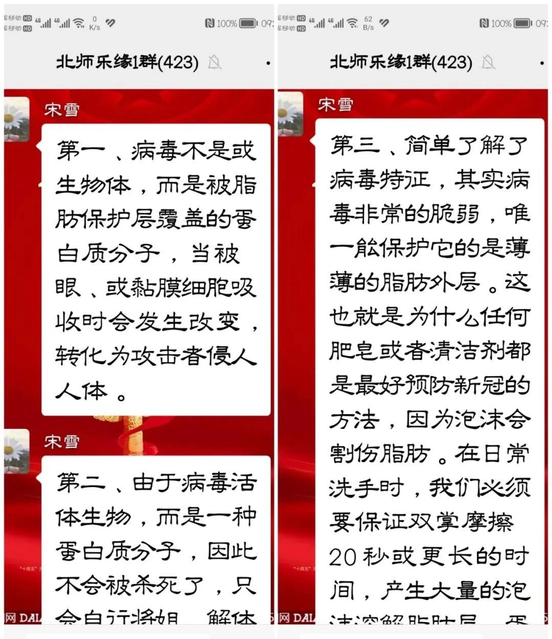 为进一步落实新冠肺炎疫情防控措施,帮助大家更好的学习掌握预防、自治新冠肺炎的方法,北师乐缘义工之家在微信群里学习《当前形势下如何预防和自治新冠肺炎》,特别邀请高级中医健康管理师宋雪老师做专题讲解。为筹备好这场线上专题讲解,北师乐缘义工之家队长吴浩然,在一周前就发出通知,做好了充分的前期准备工作。12月11日下午3点,专题讲解如期在线上举办,公益微信群里423人直接受益,宋雪老师也是做好了充分的备案,用文字的形式,全面详细的对新冠肺炎的认知、预防、治疗进行了精确的、科学的阐述,这是在全面解封的大环境下一次有益的尝试,收到了非凡的效果。