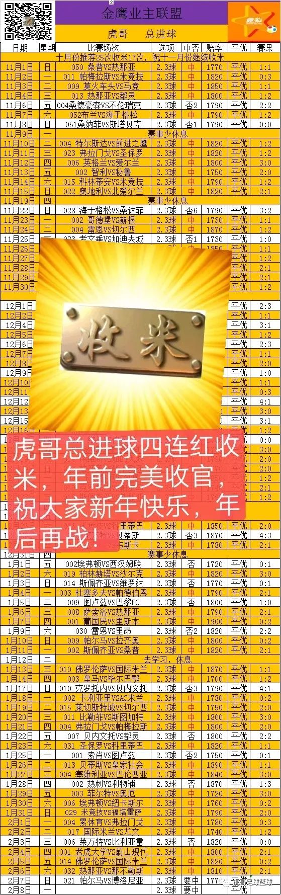 虎哥竞猜推荐总进球四连红收米!